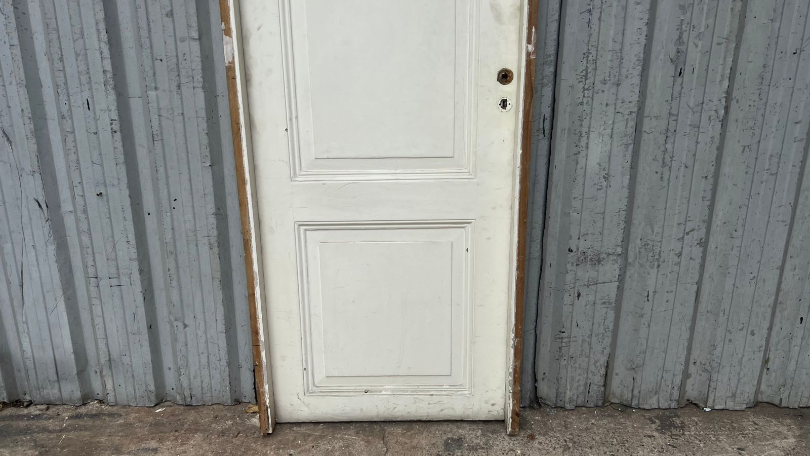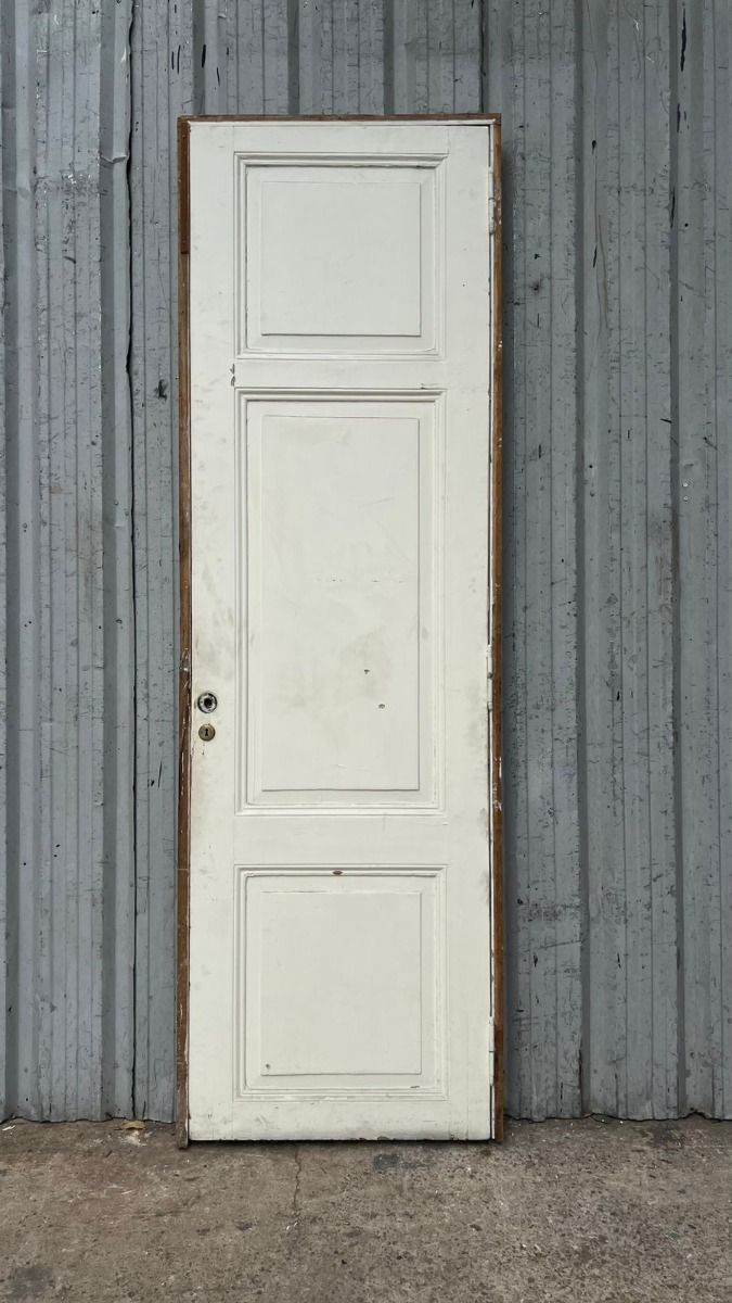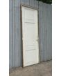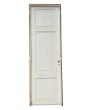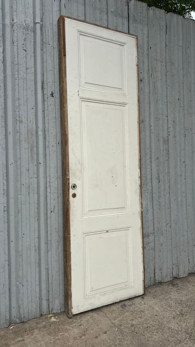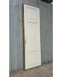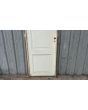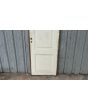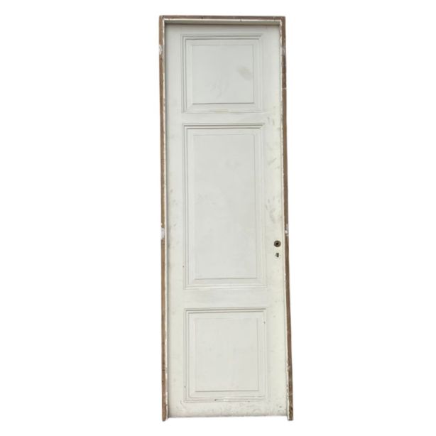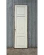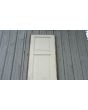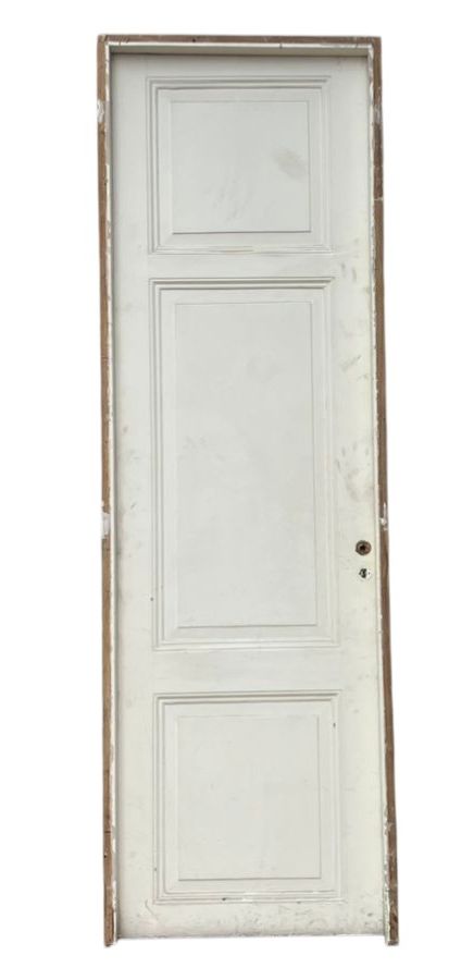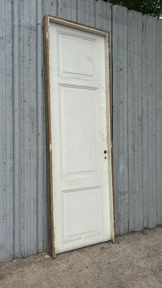 Antigua puerta de madera cedro pintada de blanco. Es a una hoja de abrir hacia la izquierda, con tableros doble replanados y marco de madera. La abertura no incluye la cerradura ni el picaporte. Hoja de 77x258cm.