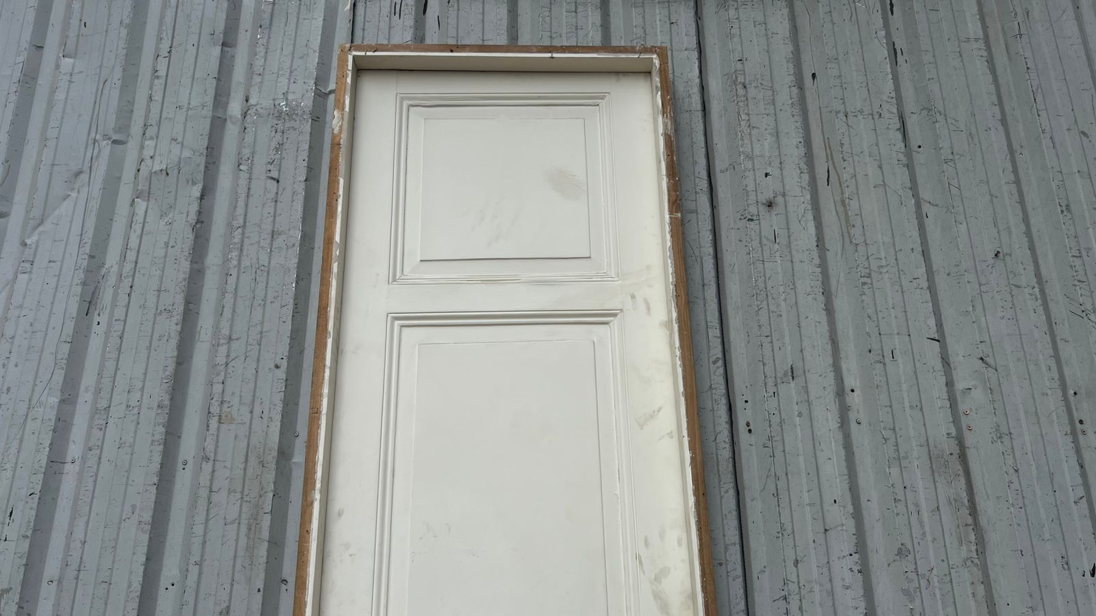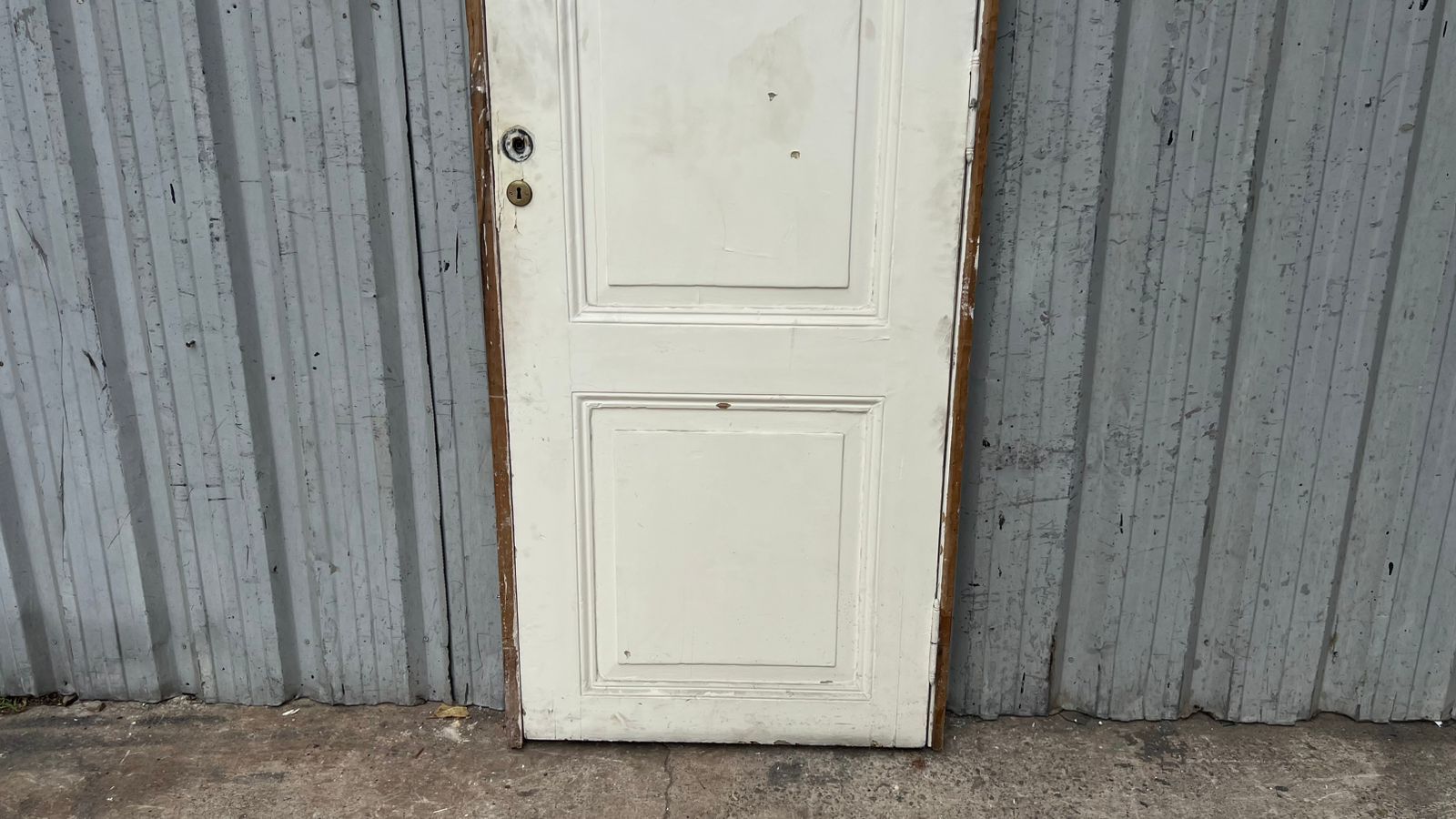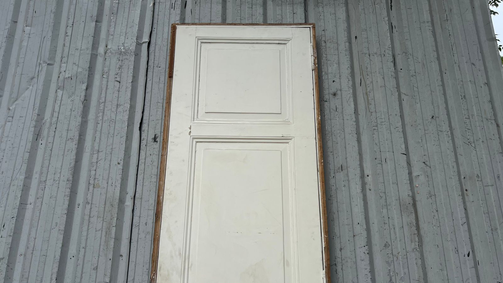 Antigua puerta de madera cedro pintada de blanco. Es a una hoja de abrir hacia la izquierda, con tableros doble replanados y marco de madera. La abertura no incluye la cerradura ni el picaporte. Hoja de 77x258cm.