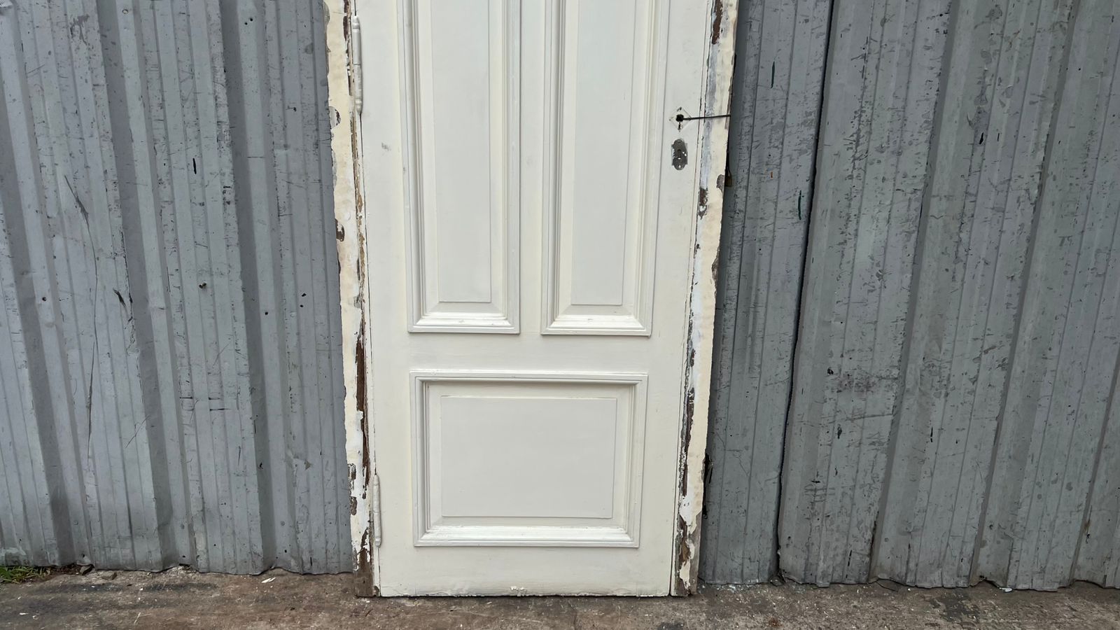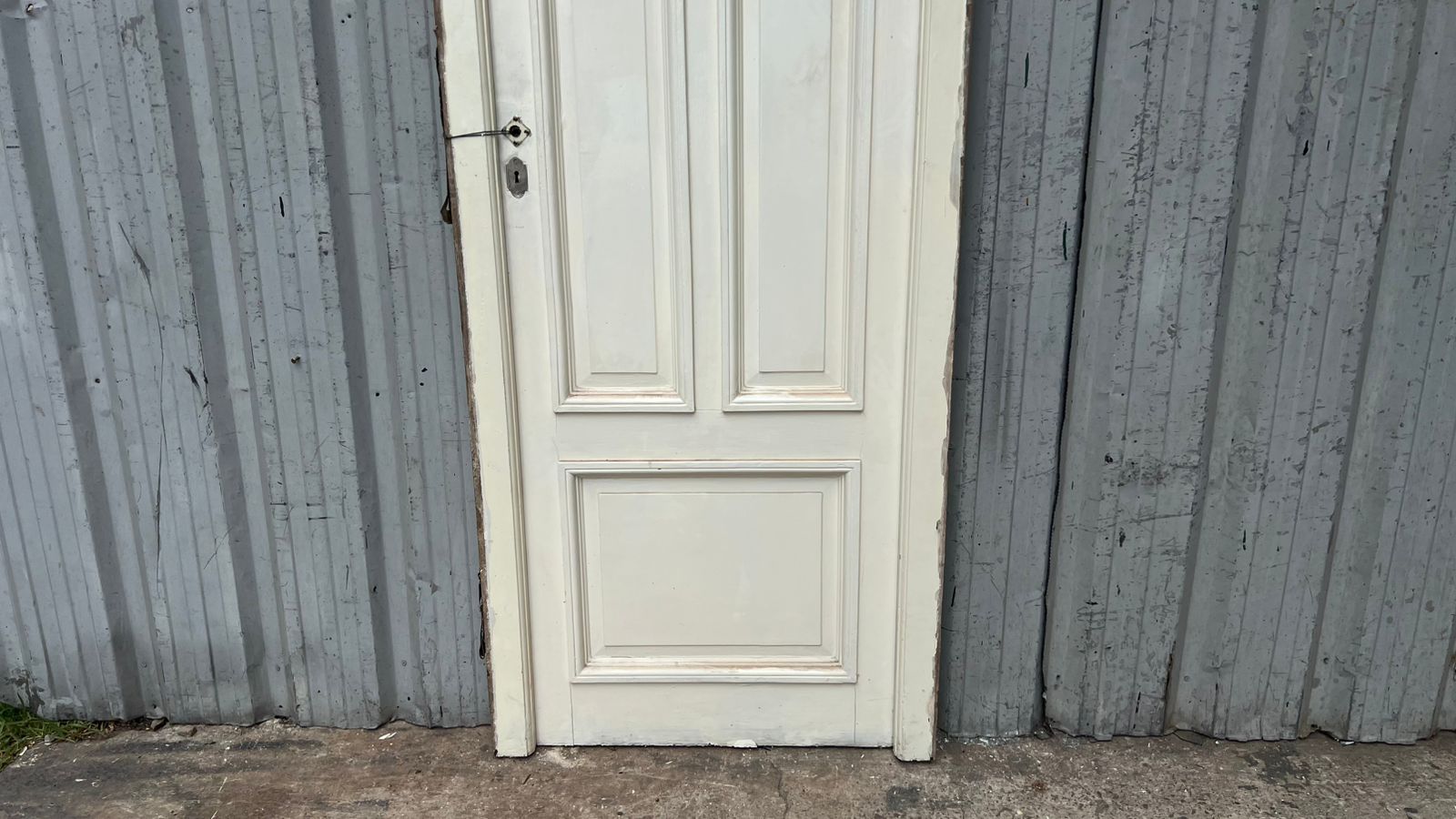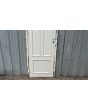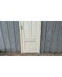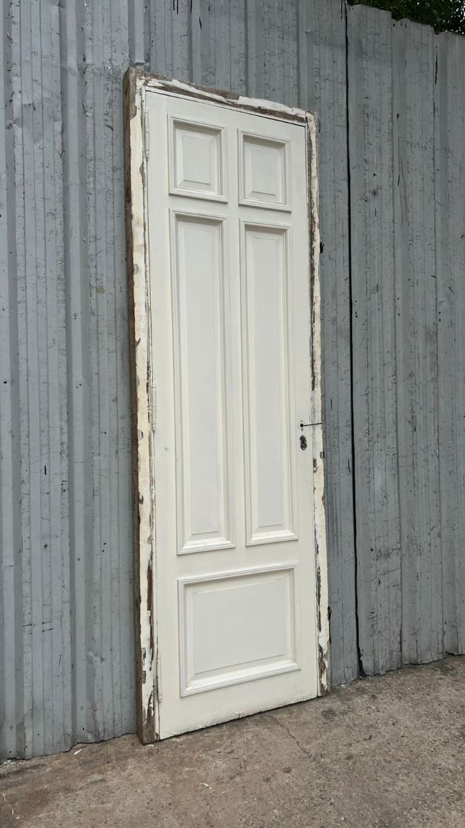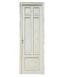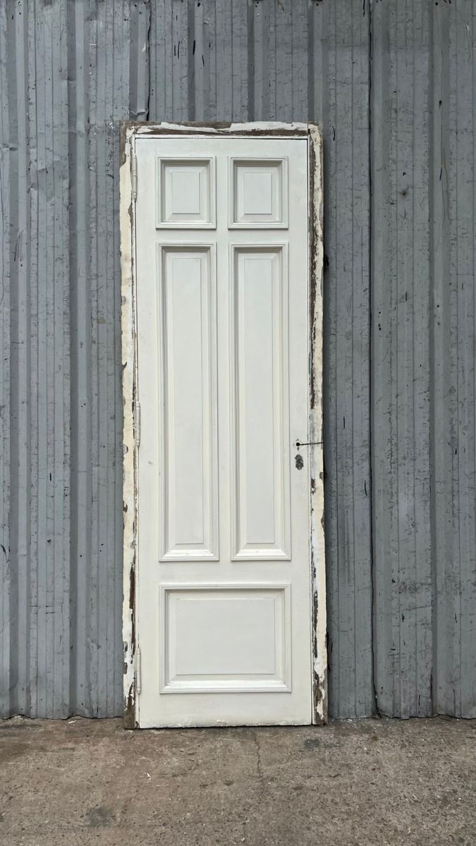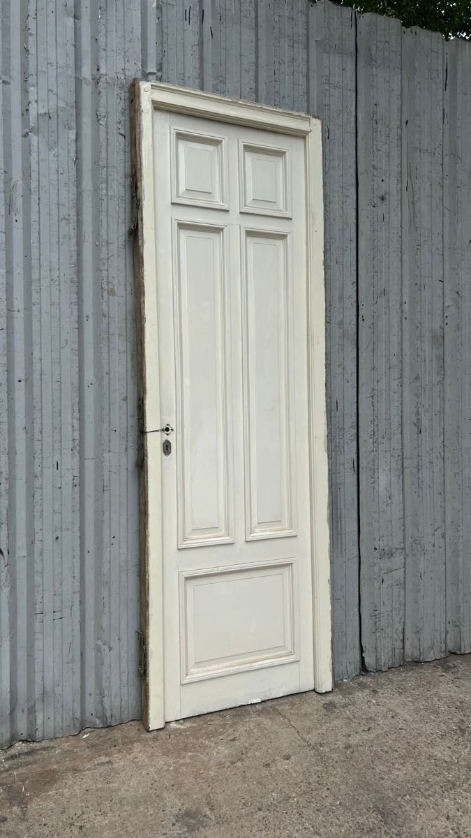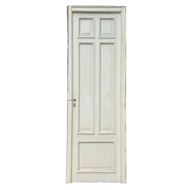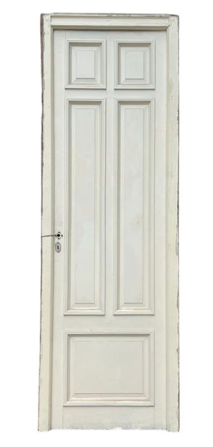 Antigua puerta de madera cedro pintada de blanco. Es a una hoja de abrir hacia la derecha, con tableros doble replanados moldurados y marco de madera. La abertura no incluye la cerradura ni el picaporte. Hoja de 71x240cm.