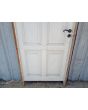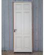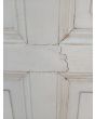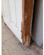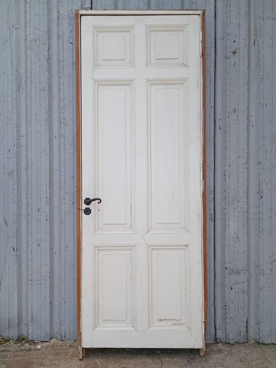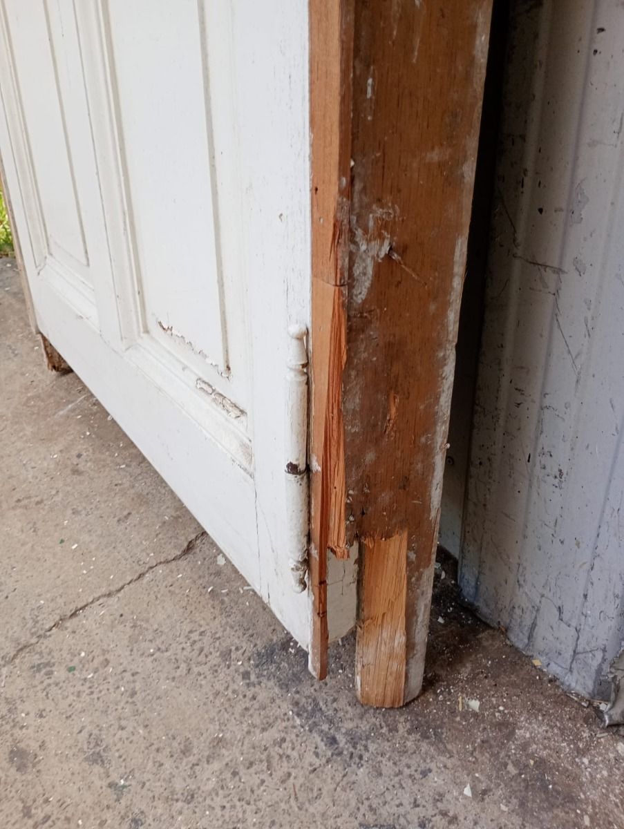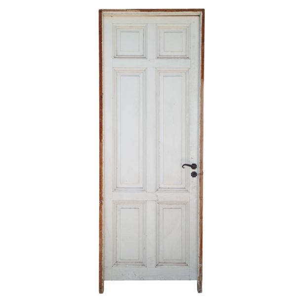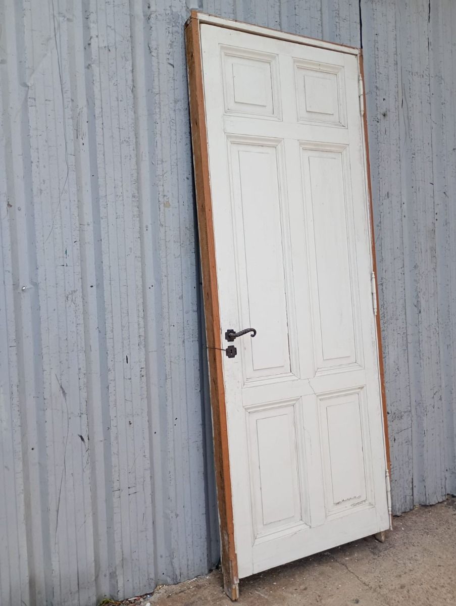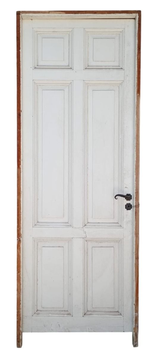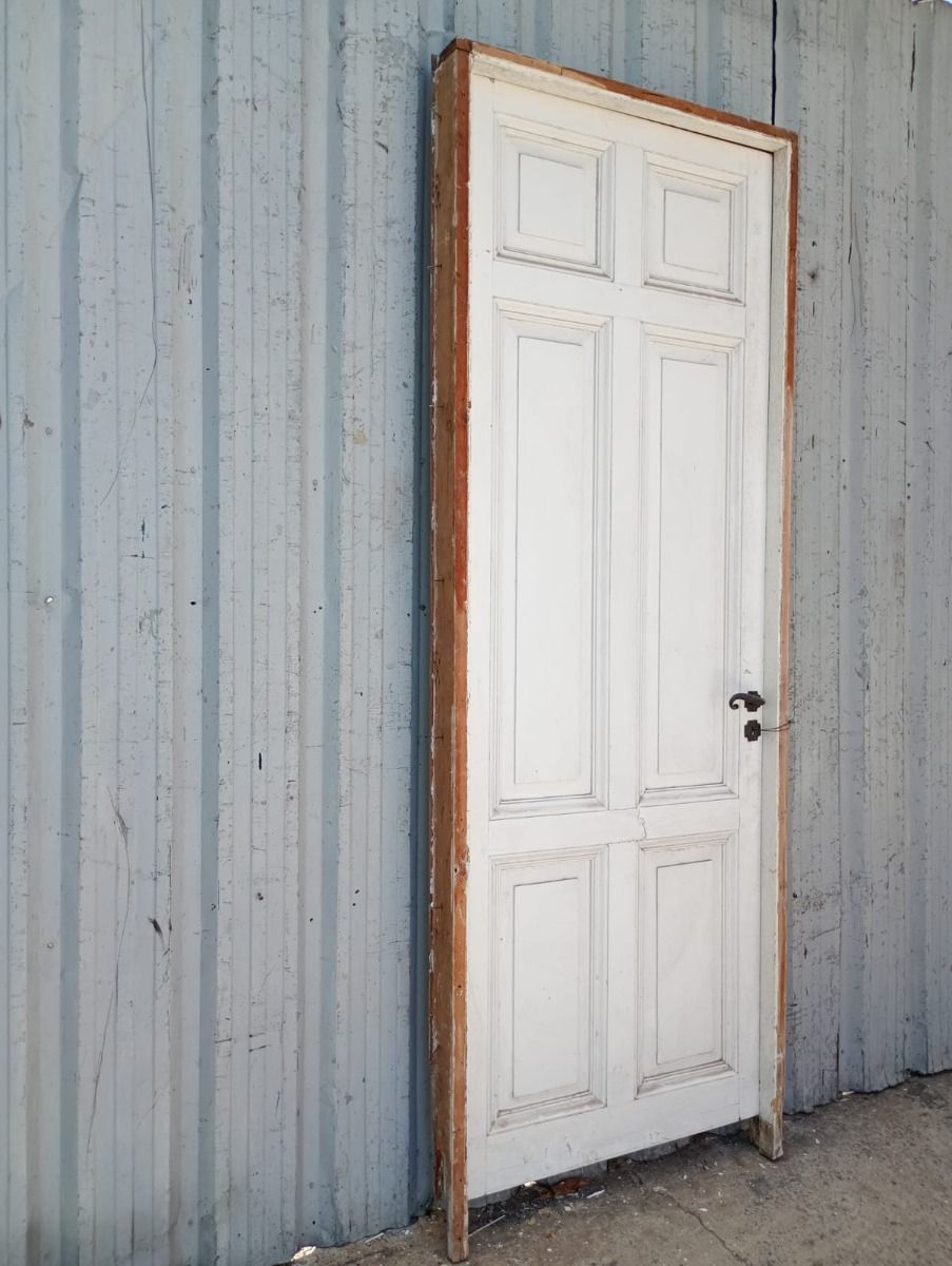 Puerta tablero de madera antigua pino brasil pintada de blanco. Es a una hoja de abrir hacia la izquierda, con tableros doble replanados, picaporte de hierro forjado y marco de madera cedro. La abertura tiene detalles a reparar en su hoja y marco que pueden observarse en las fotografías. La abertura no incluye cerradura ni llave. Hoja de 85x236cm.