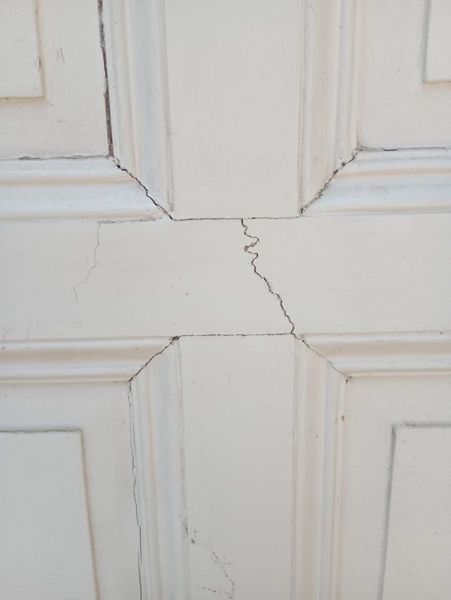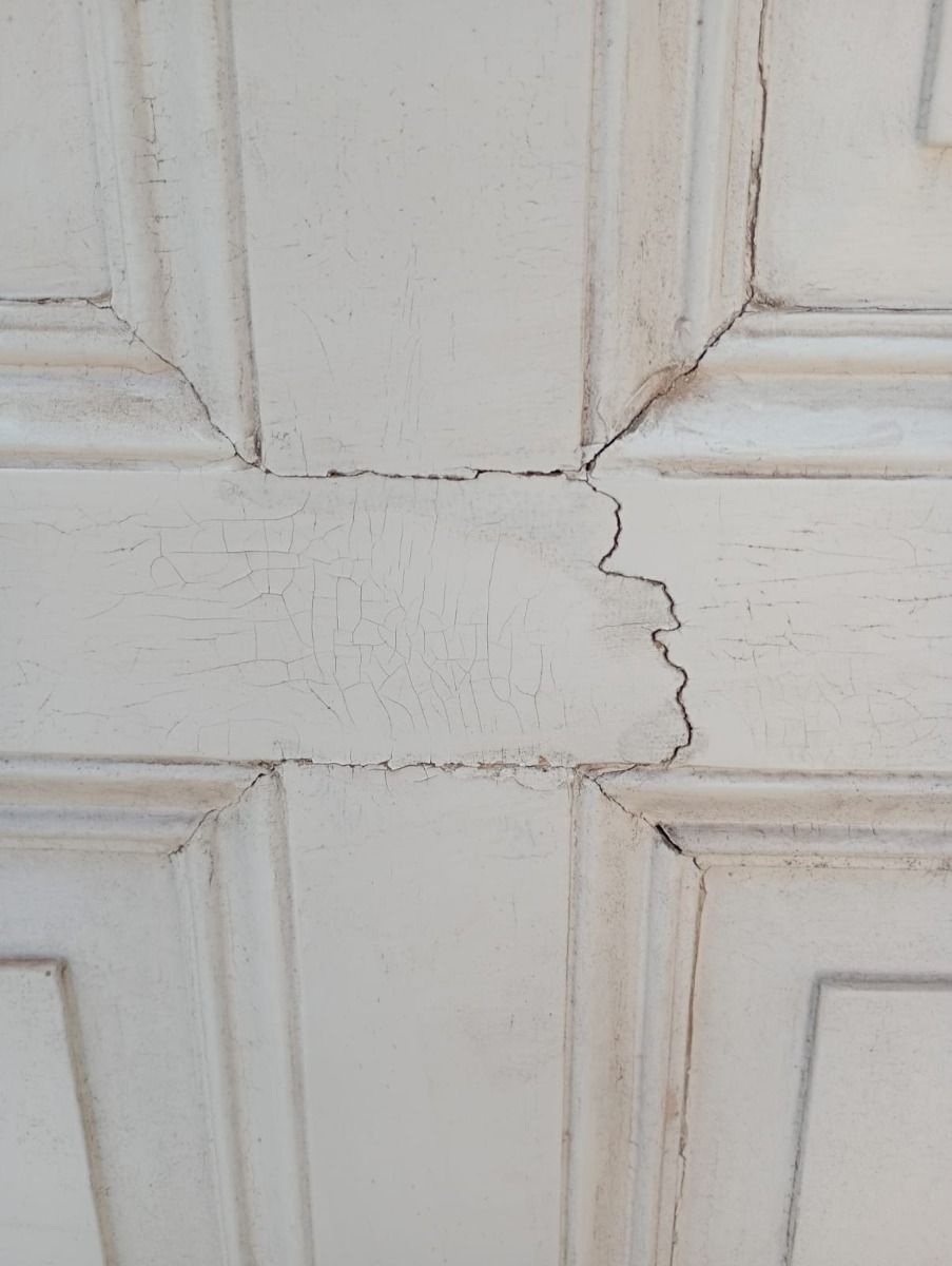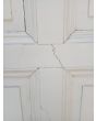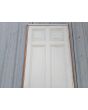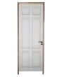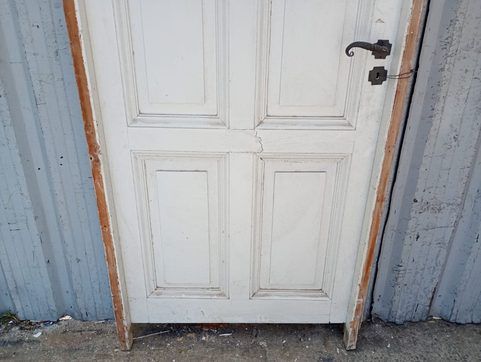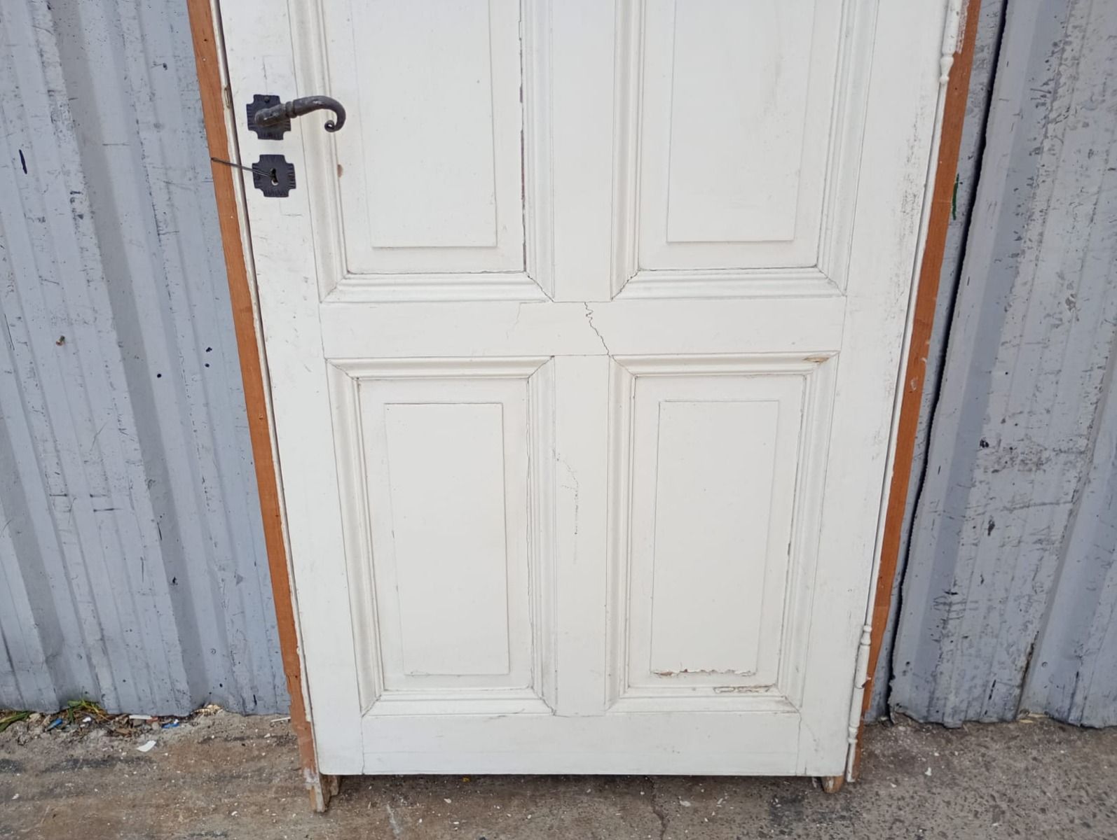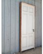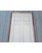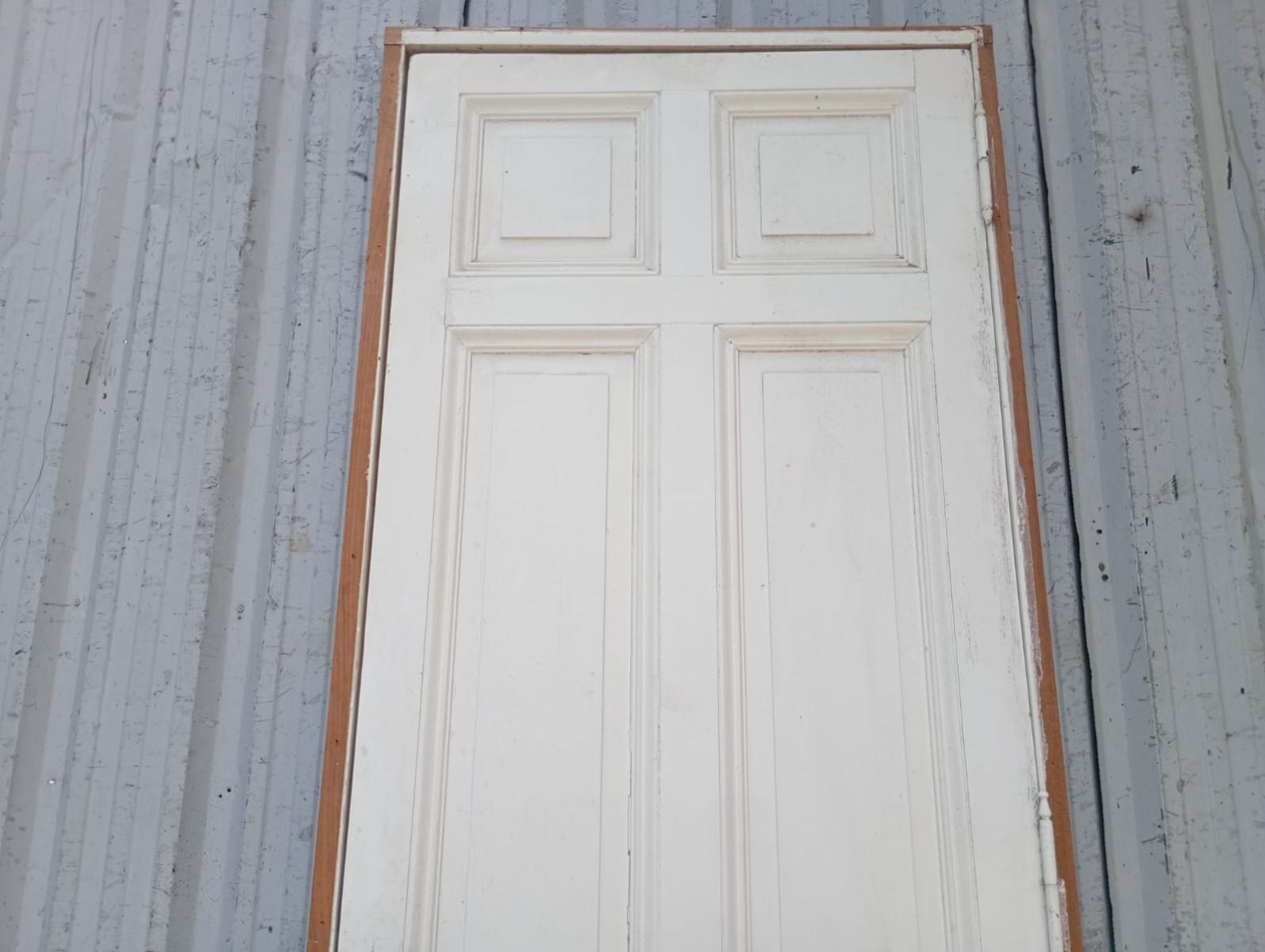 Puerta tablero de madera antigua pino brasil pintada de blanco. Es a una hoja de abrir hacia la izquierda, con tableros doble replanados, picaporte de hierro forjado y marco de madera cedro. La abertura tiene detalles a reparar en su hoja y marco que pueden observarse en las fotografías. La abertura no incluye cerradura ni llave. Hoja de 85x236cm.