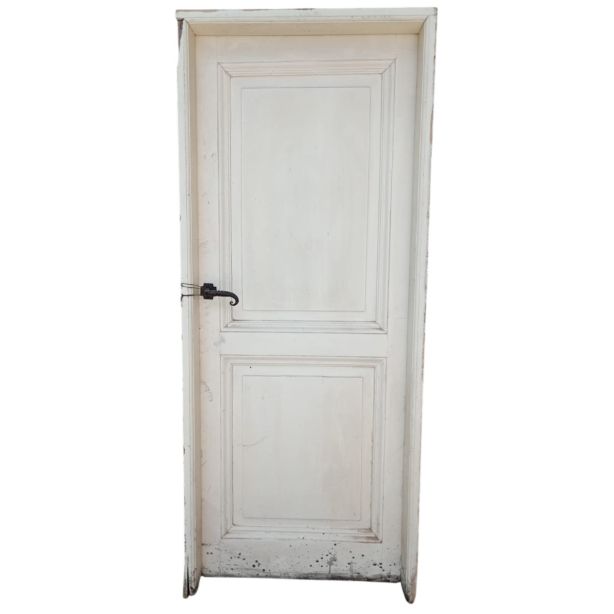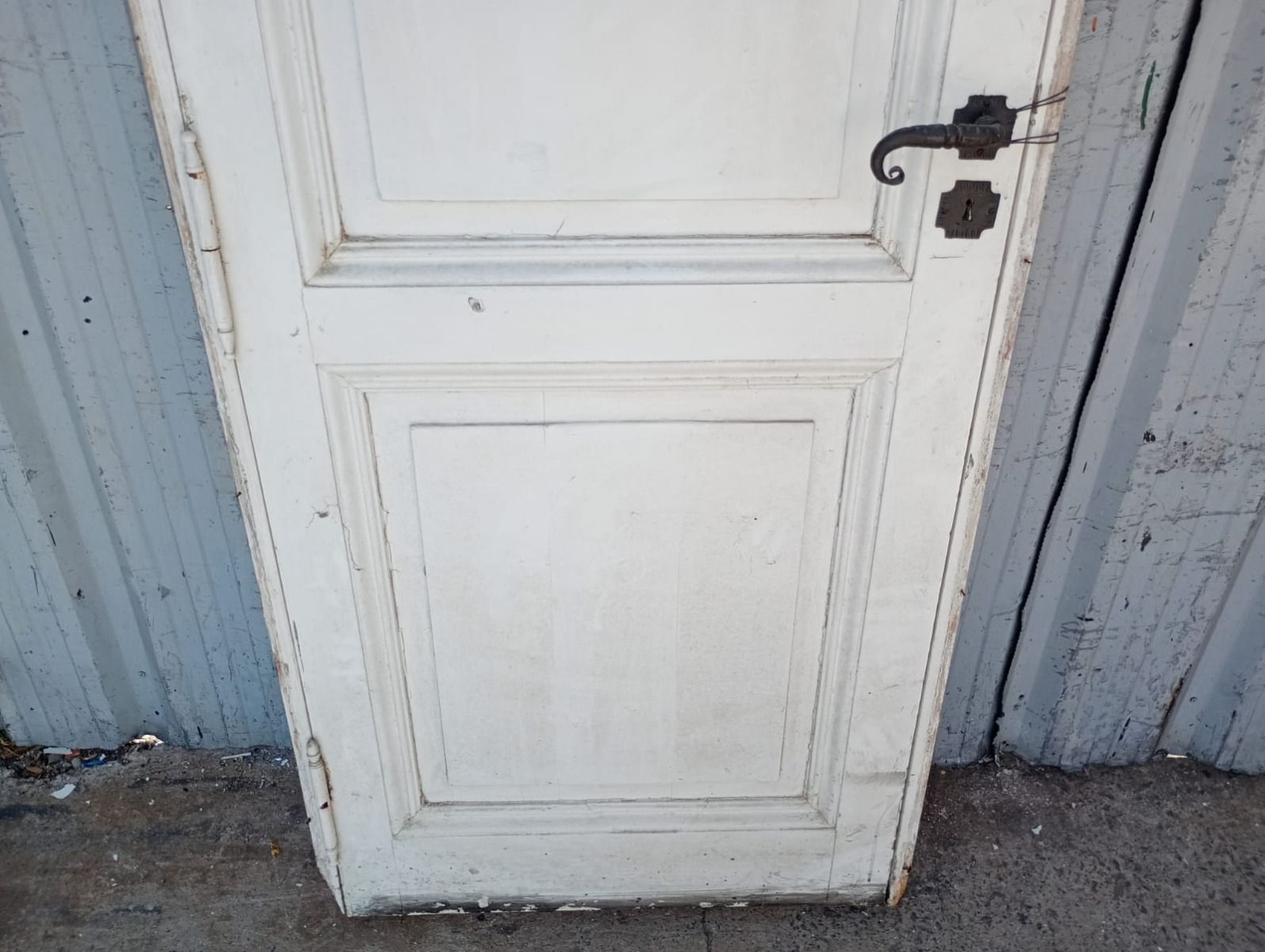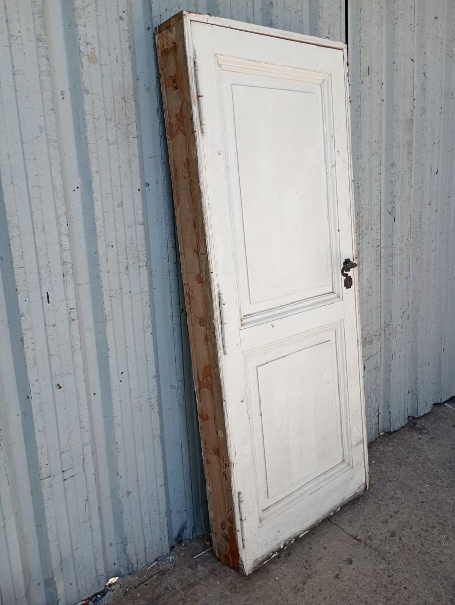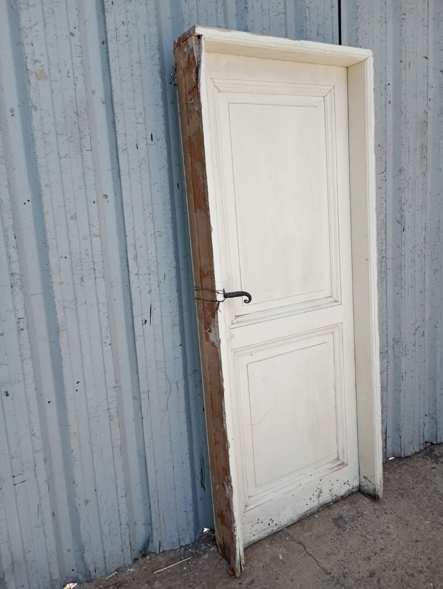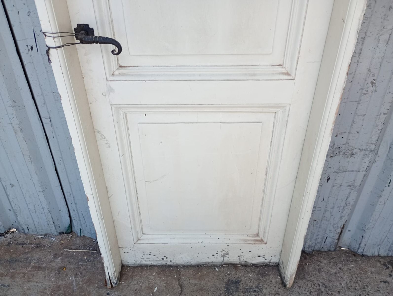 Puerta tablero petit de madera antigua pino brasil pintada de blanco. Es a una hoja de abrir hacia la derecha, con tableros doble replanados, picaporte de hierro forjado y marco de madera cedro. La abertura tiene un detalle a reparar en el marco que puede observarse en las fotografías. No incluye cerradura ni llave. Hoja de 69x177cm.