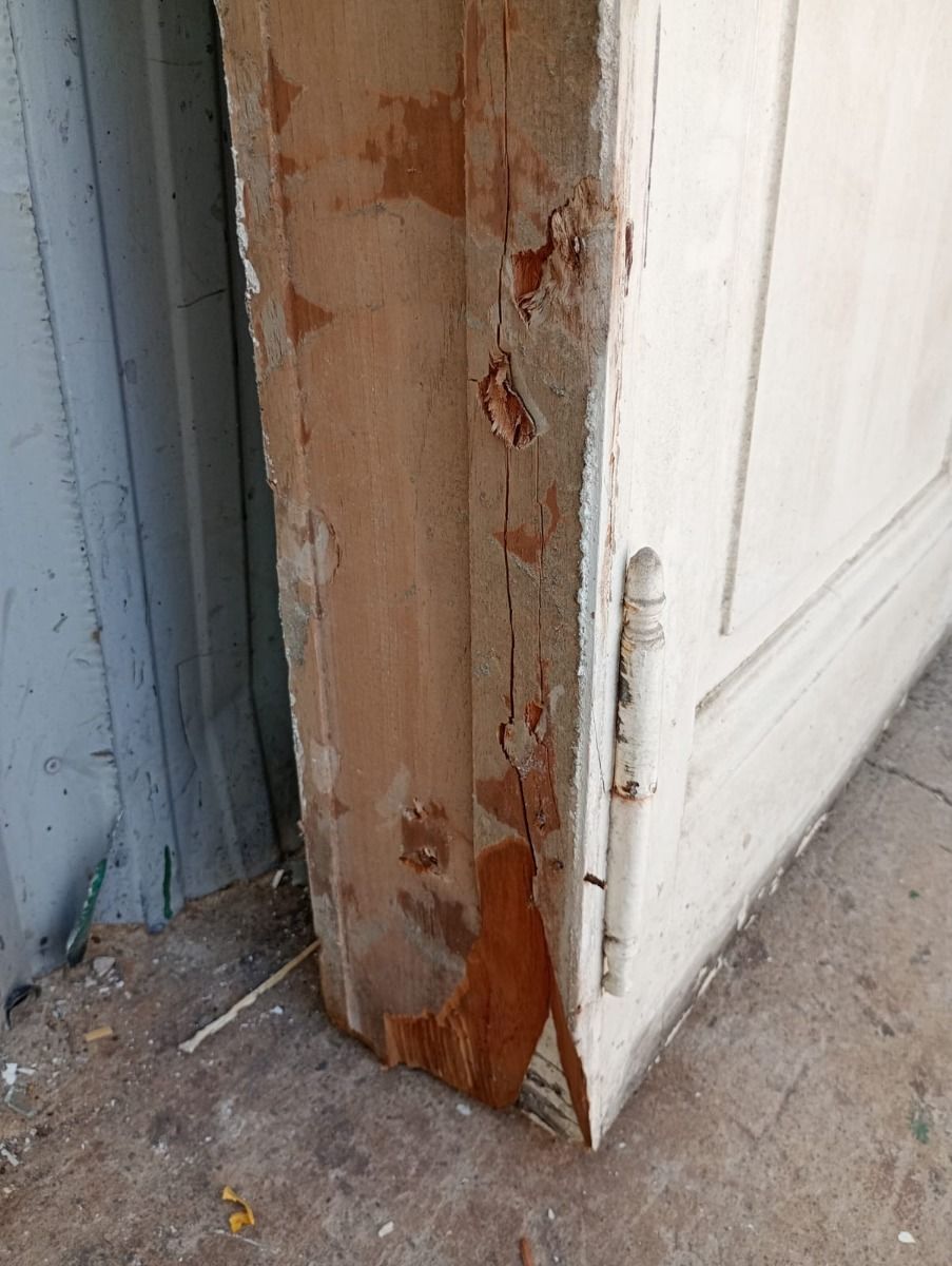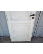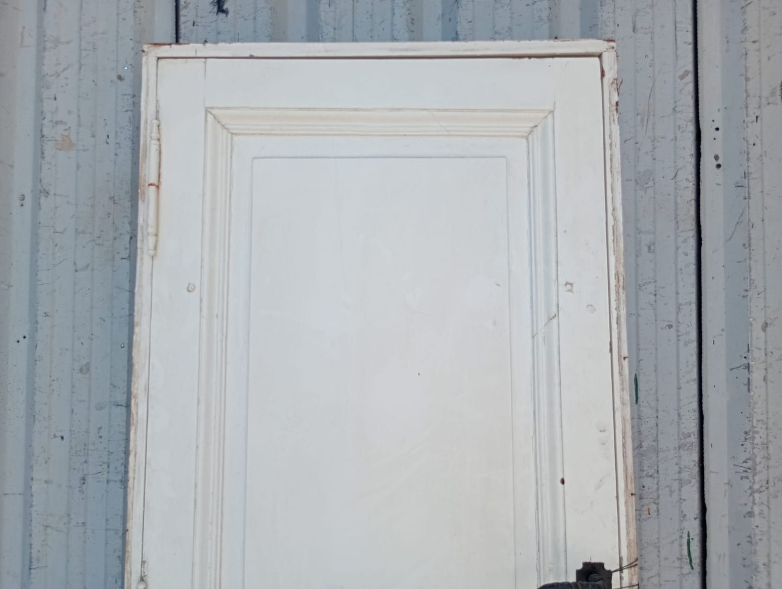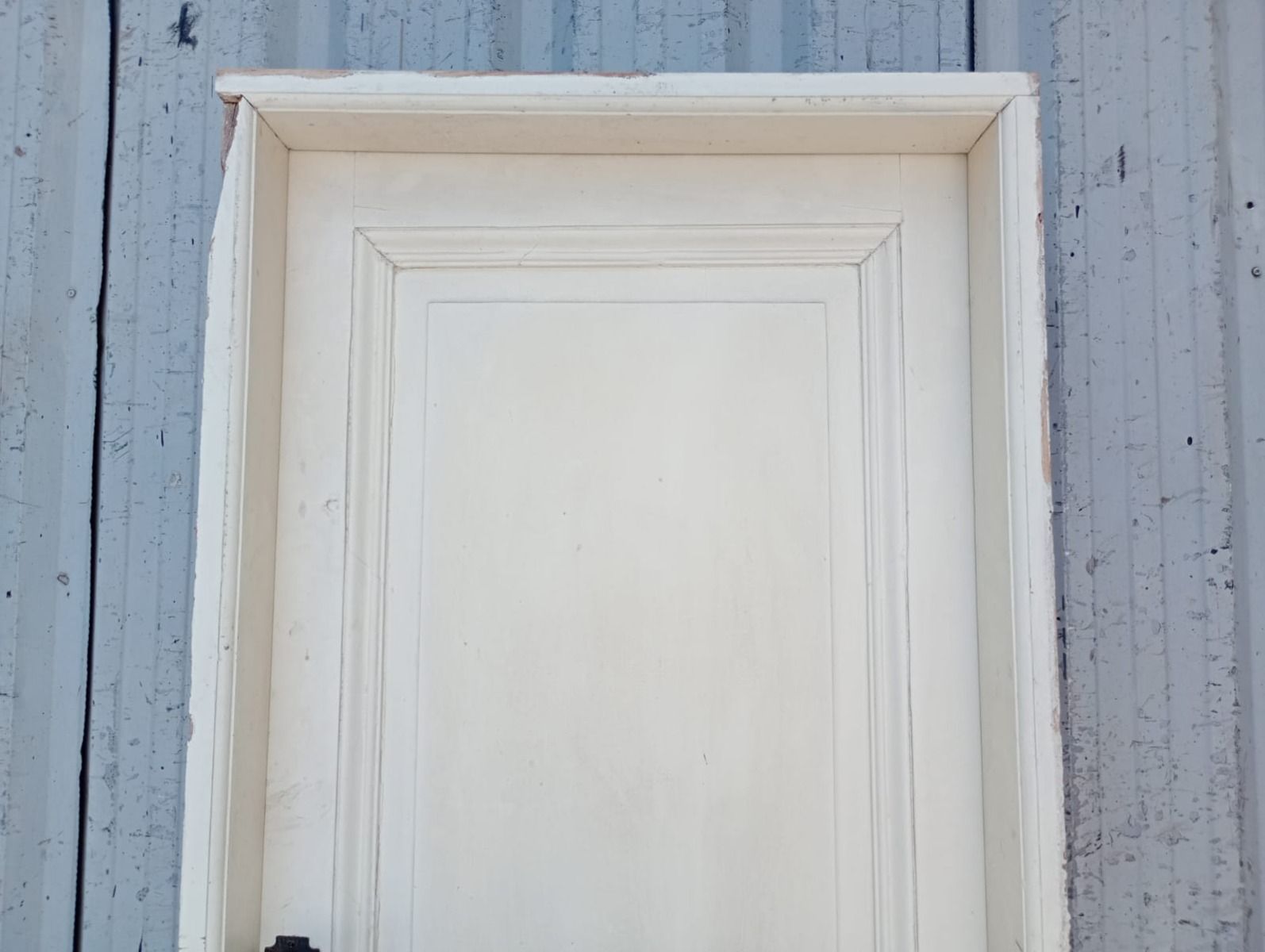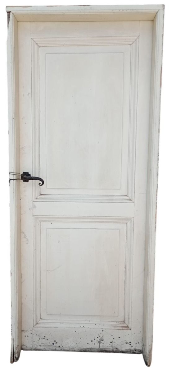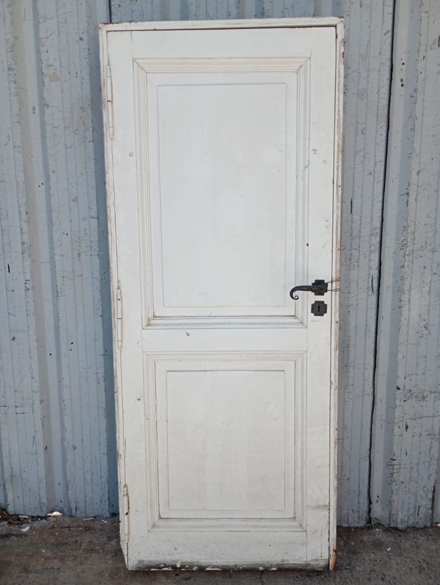 Puerta tablero petit de madera antigua pino brasil pintada de blanco. Es a una hoja de abrir hacia la derecha, con tableros doble replanados, picaporte de hierro forjado y marco de madera cedro. La abertura tiene un detalle a reparar en el marco que puede observarse en las fotografías. No incluye cerradura ni llave. Hoja de 69x177cm.
