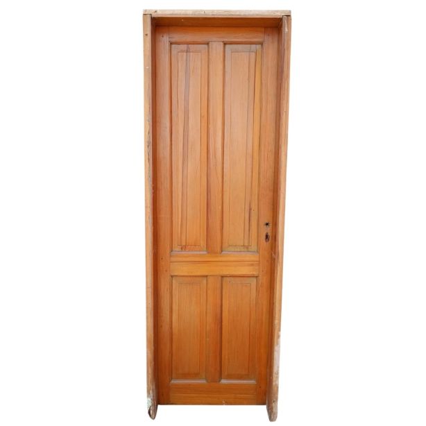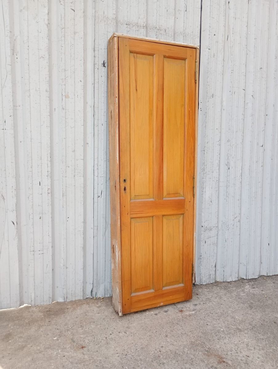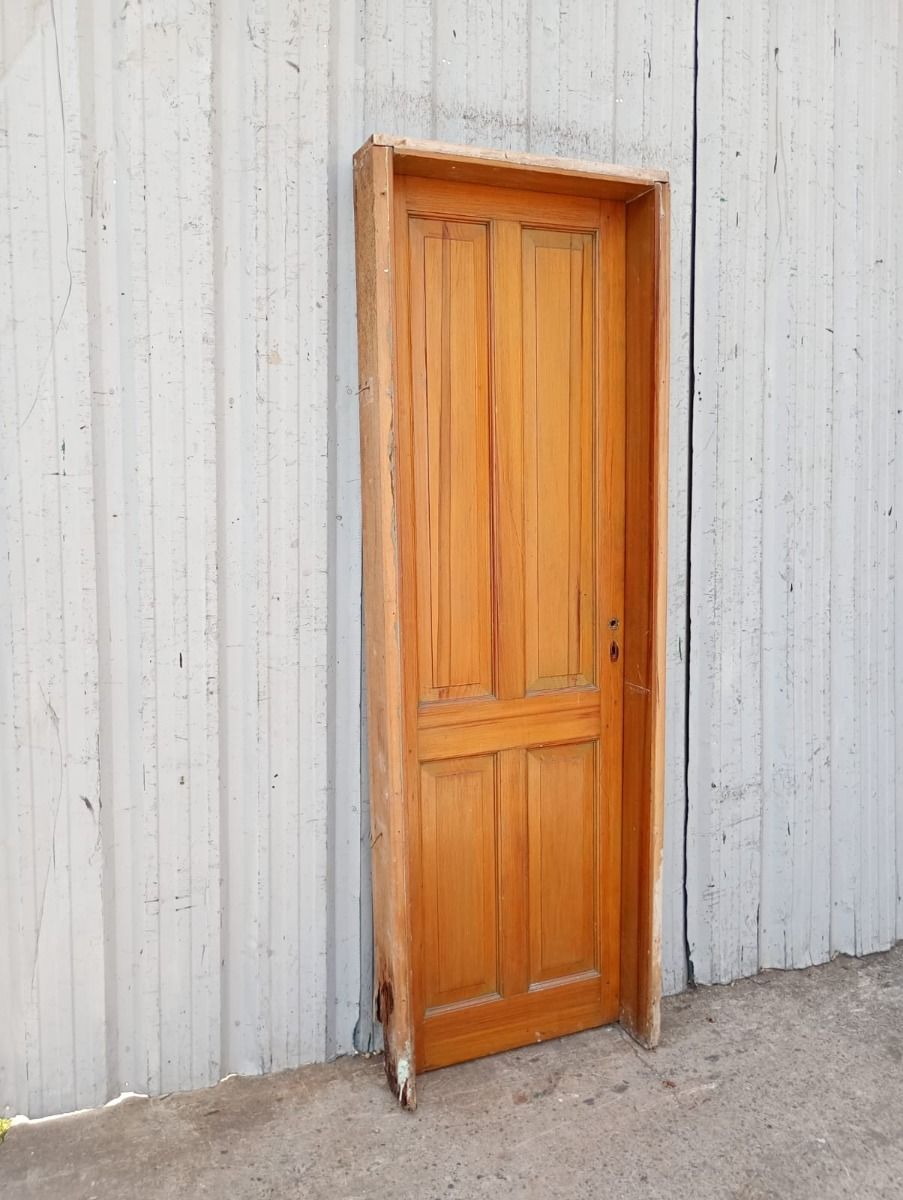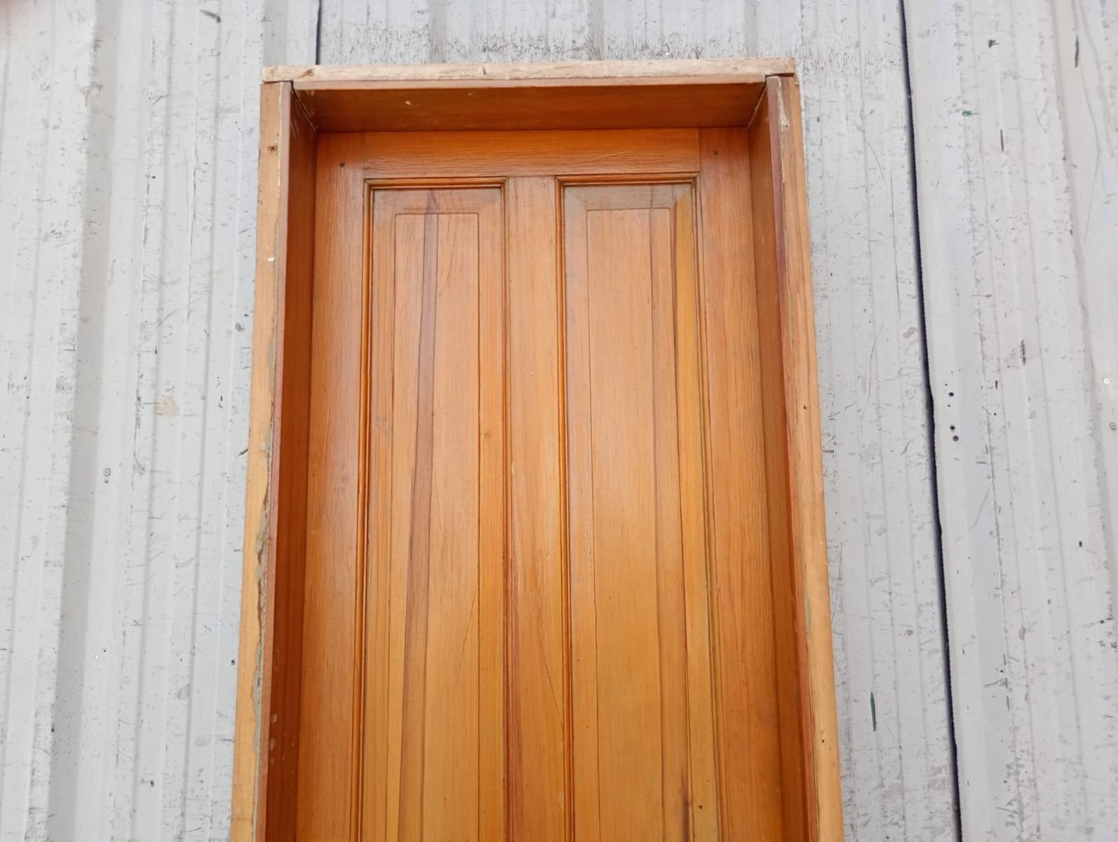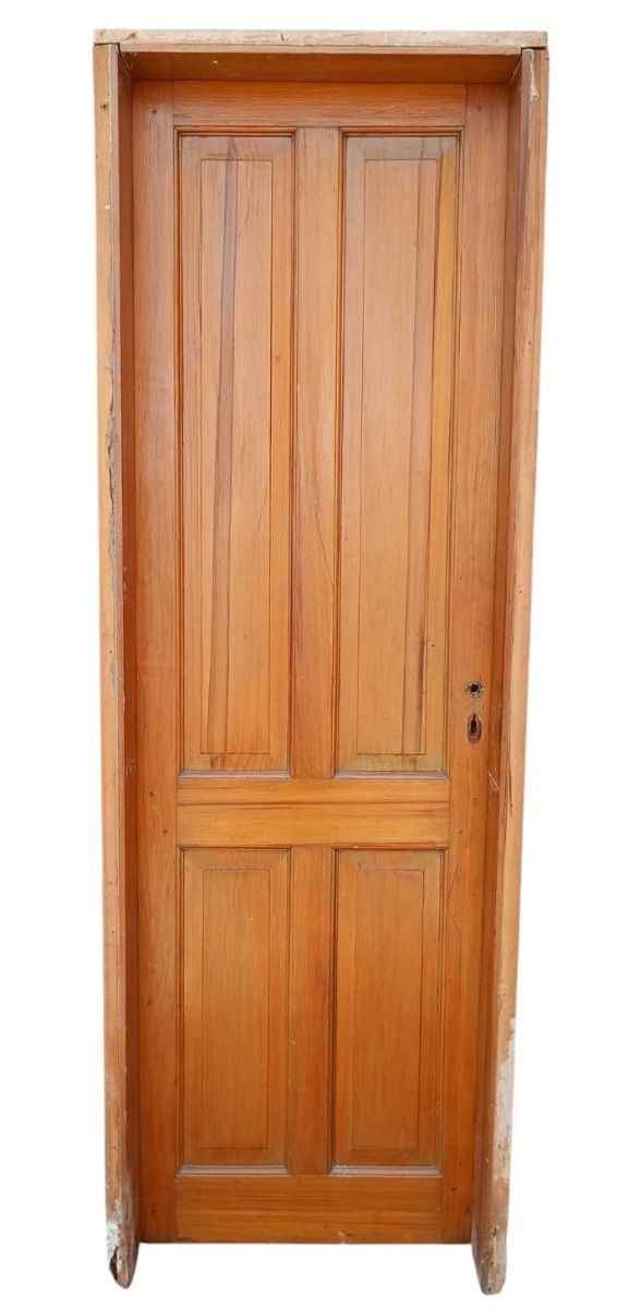 Puerta tablero de madera antigua pino brasil al natural con cetol. Es a una hoja de abrir hacia la izquierda, con tableros doble replanados inferiores y marco de madera dura. El marco tiene una pequeña avería que se puede observar en las fotos. La abertura no incluye cerradura ni llave. Hoja de 65x210cm.