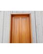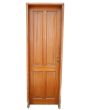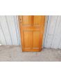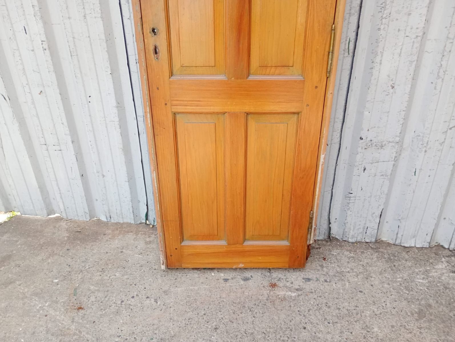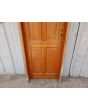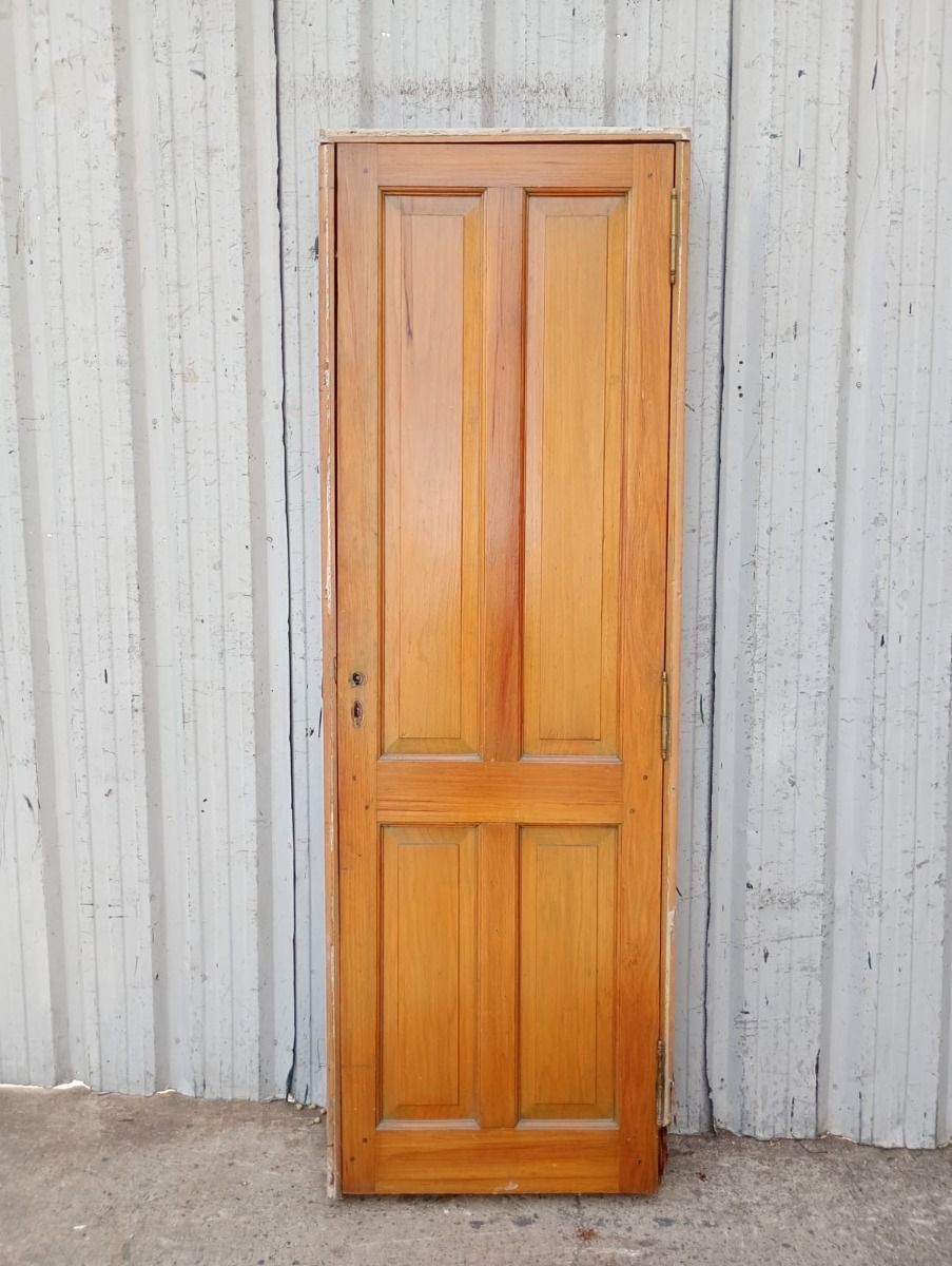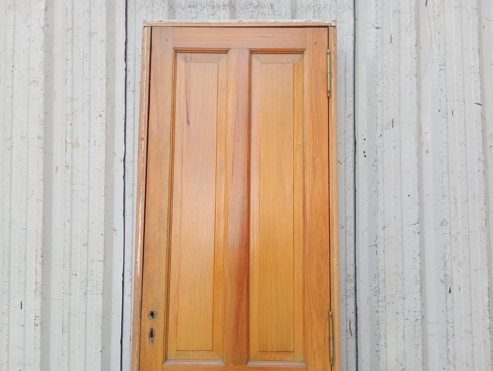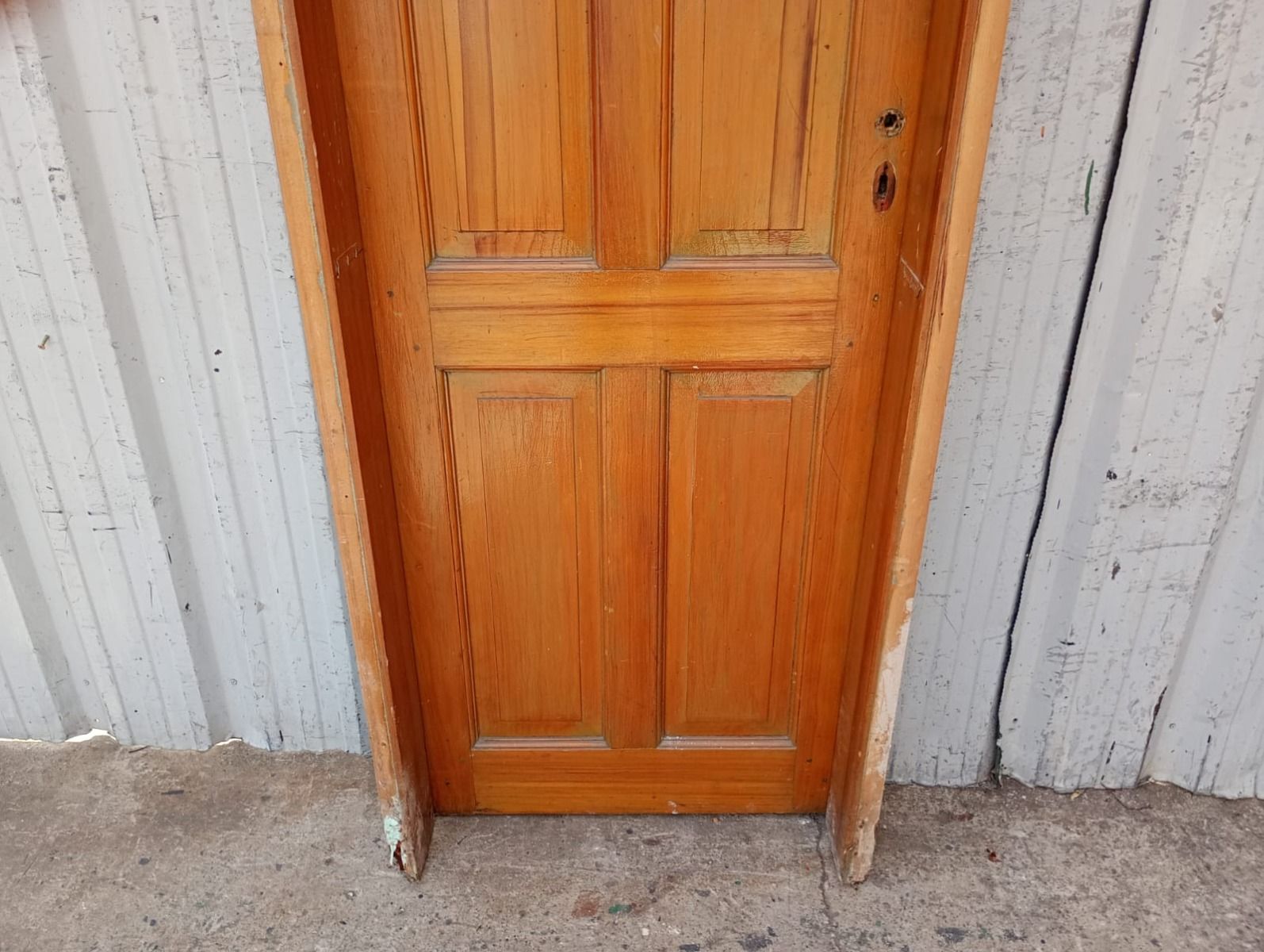 Puerta tablero de madera antigua pino brasil al natural con cetol. Es a una hoja de abrir hacia la izquierda, con tableros doble replanados inferiores y marco de madera dura. El marco tiene una pequeña avería que se puede observar en las fotos. La abertura no incluye cerradura ni llave. Hoja de 65x210cm.
