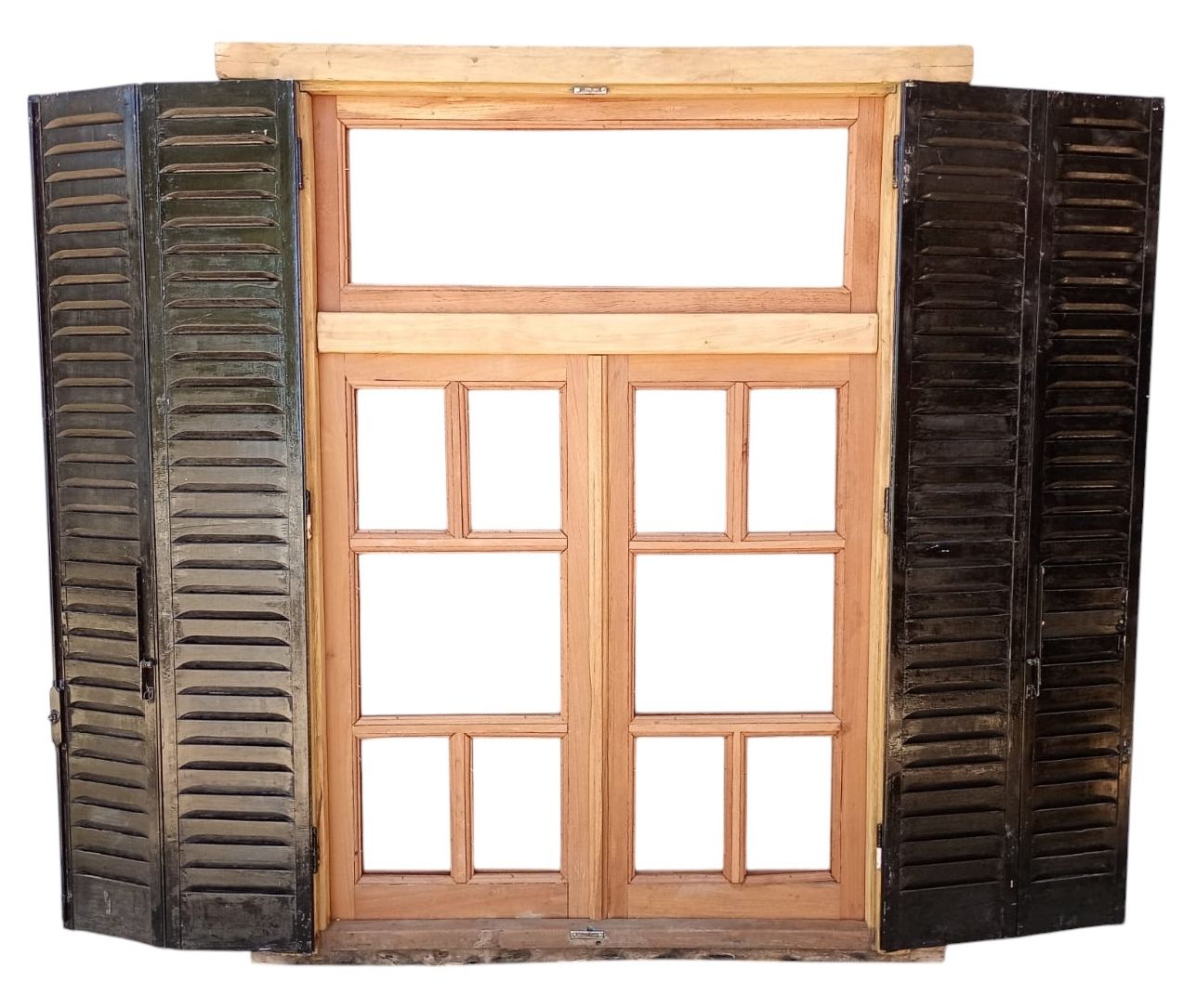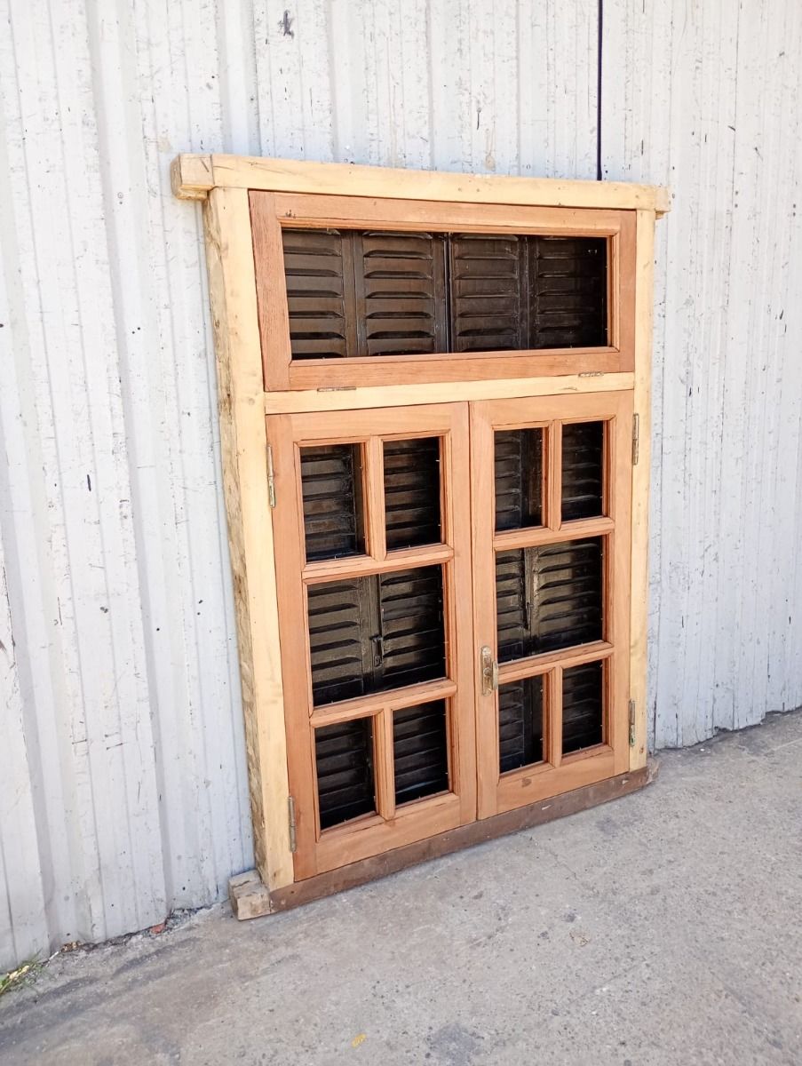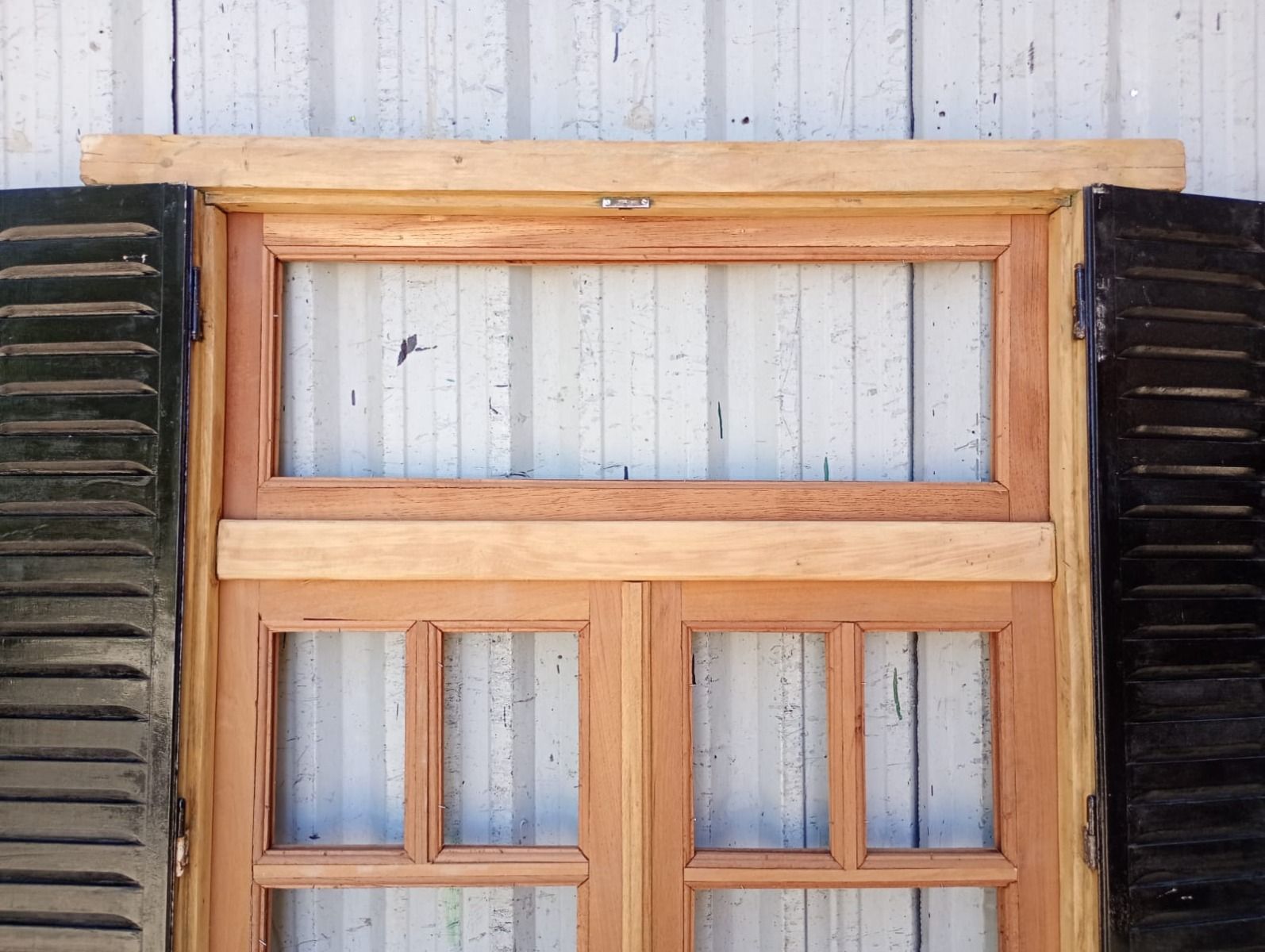 Antigua ventana de madera cedro al natural. Es a dos hojas de abrir, con vidrios tipo griegos, falleba interna, banderola de abrir, celosías mixtas y marco de madera dura. La abertura no incluye los vidrios. Hojas de 50x108cm.