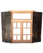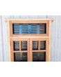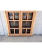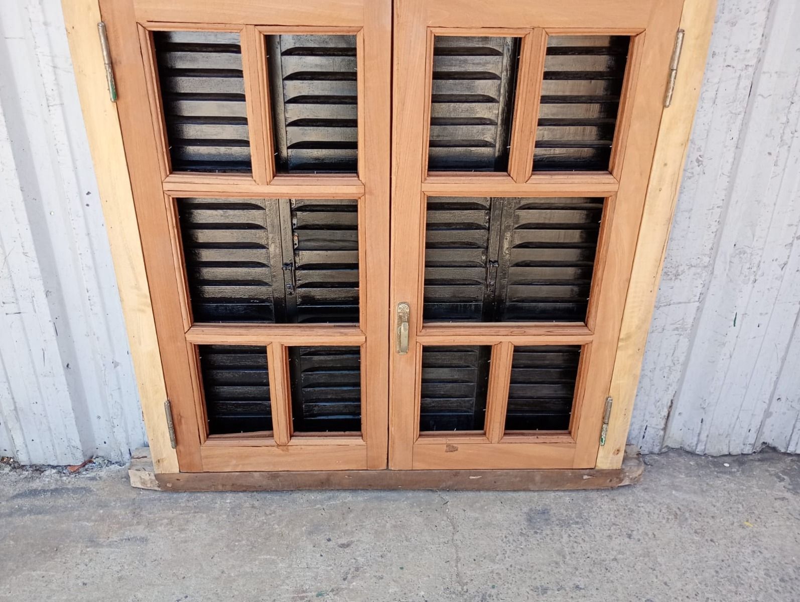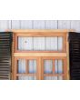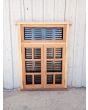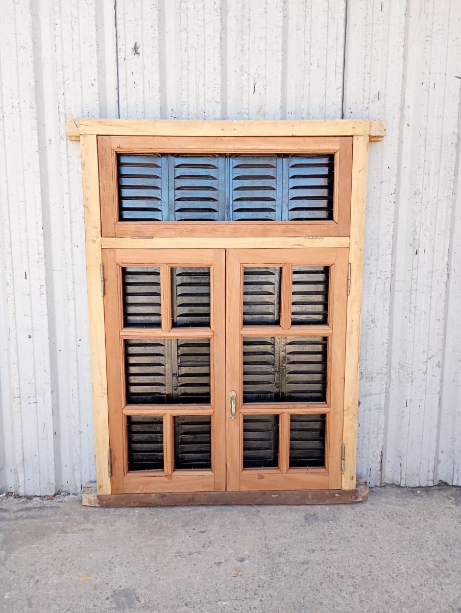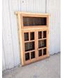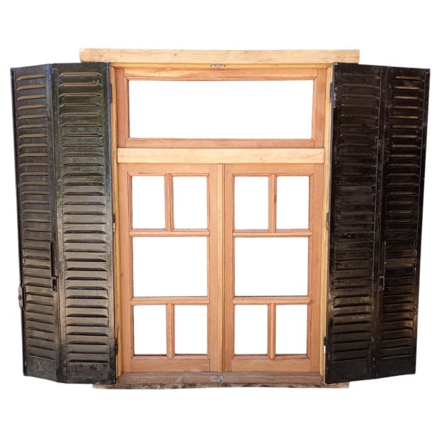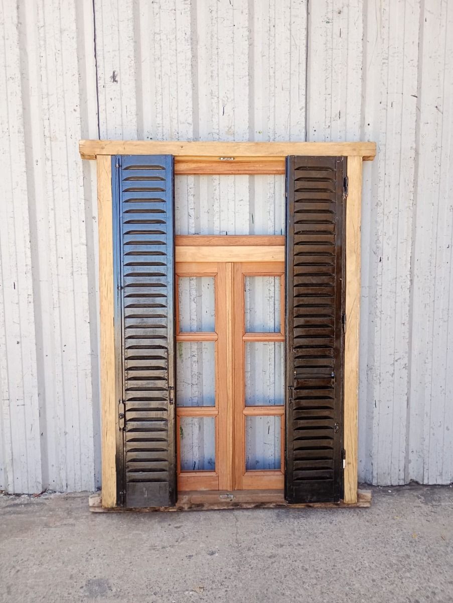 Antigua ventana de madera cedro al natural. Es a dos hojas de abrir, con vidrios tipo griegos, falleba interna, banderola de abrir, celosías mixtas y marco de madera dura. La abertura no incluye los vidrios. Hojas de 50x108cm.