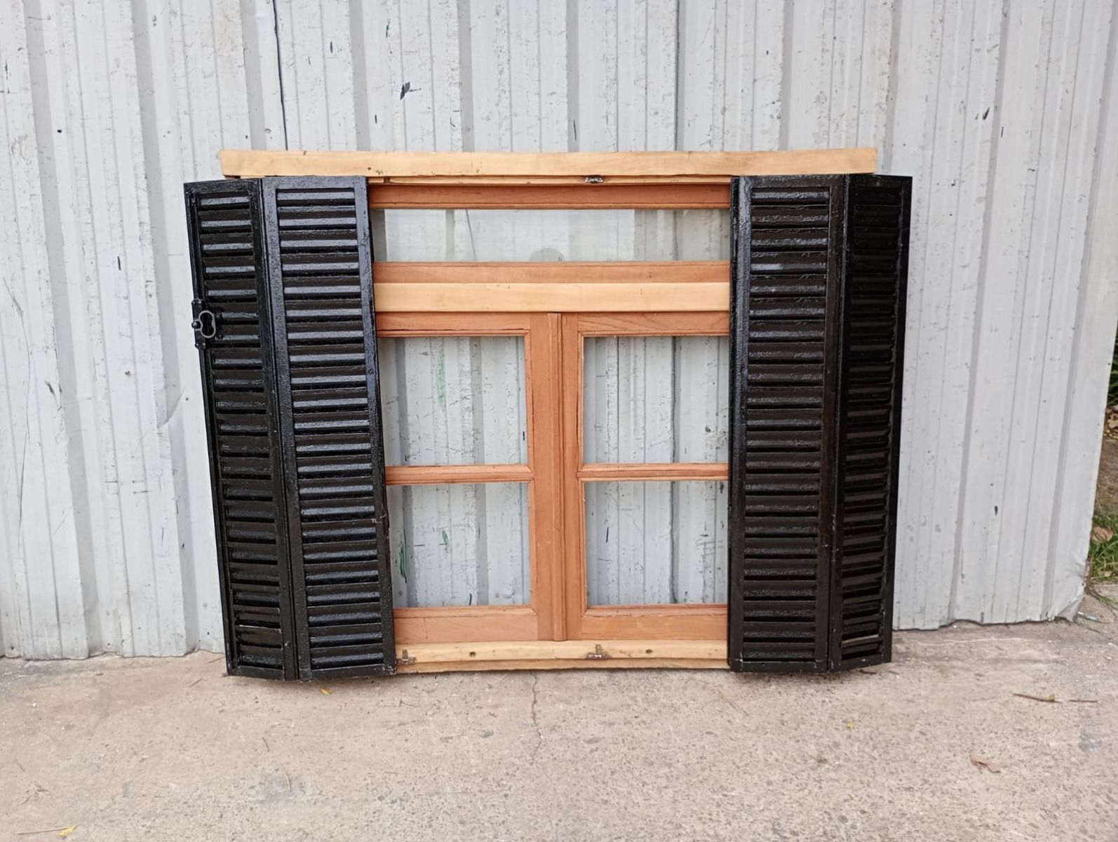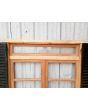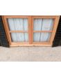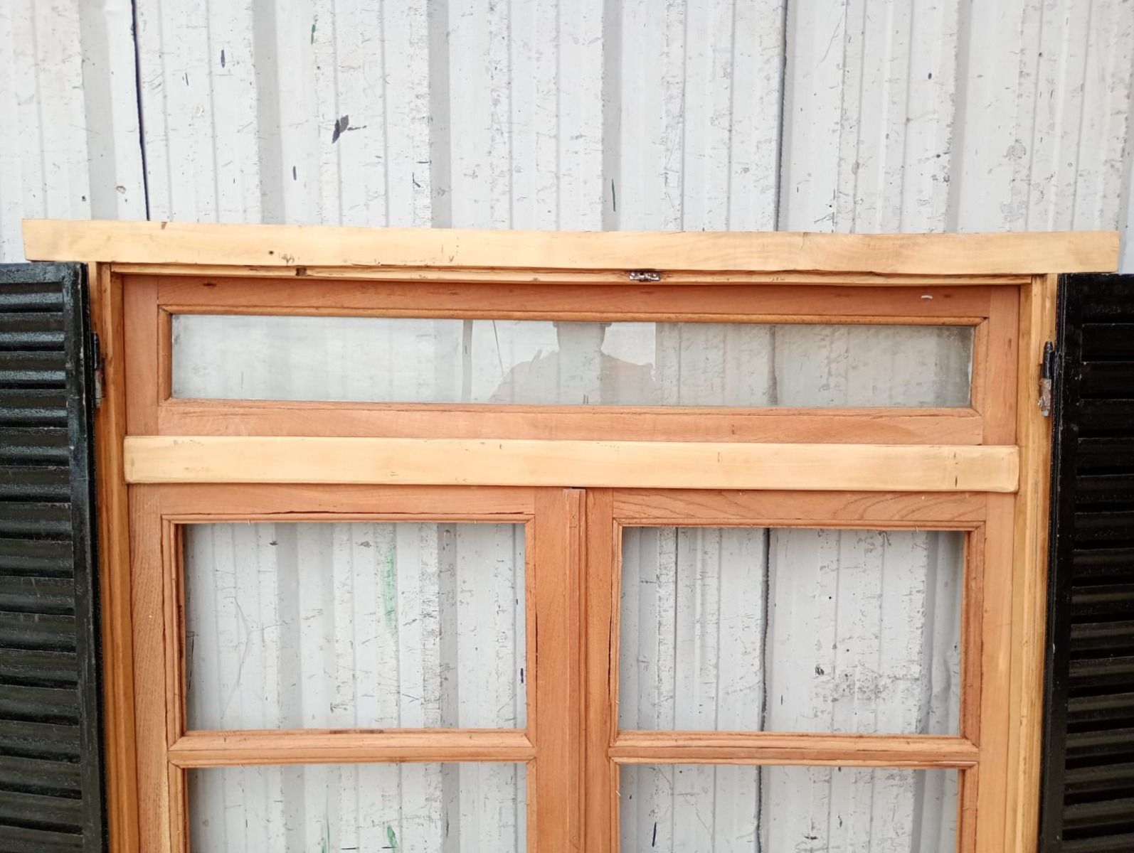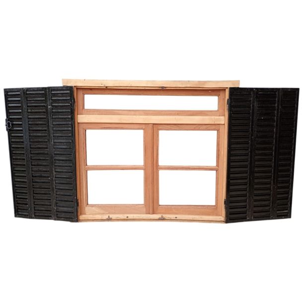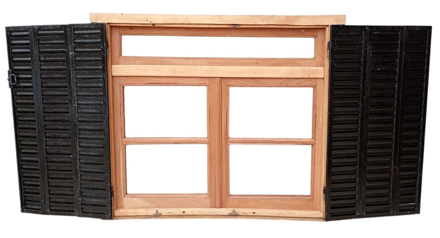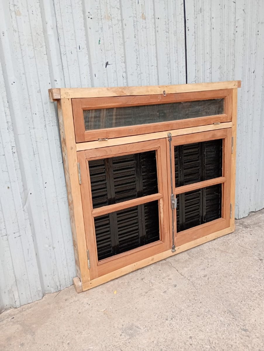 Ventana de madera antigua cedro al natural. Es a dos hojas de abrir, con vidrios tipo partidos, falleba, tapajunta, banderola vidriada de abrir, celosías de hierro y marco de madera dura. La abertura no incluye los vidrios. Hojas de 65x85cm.