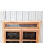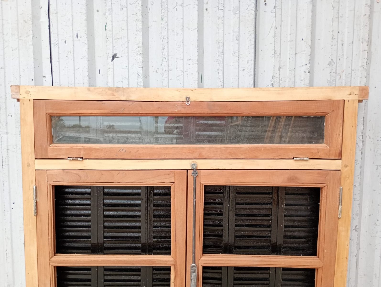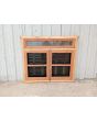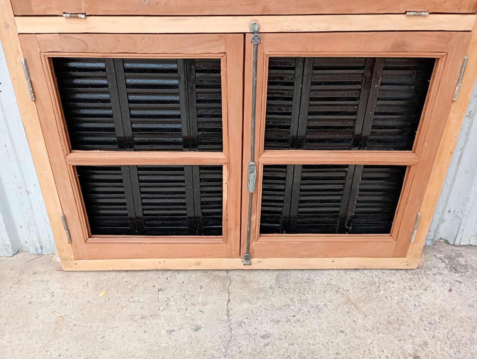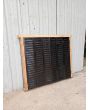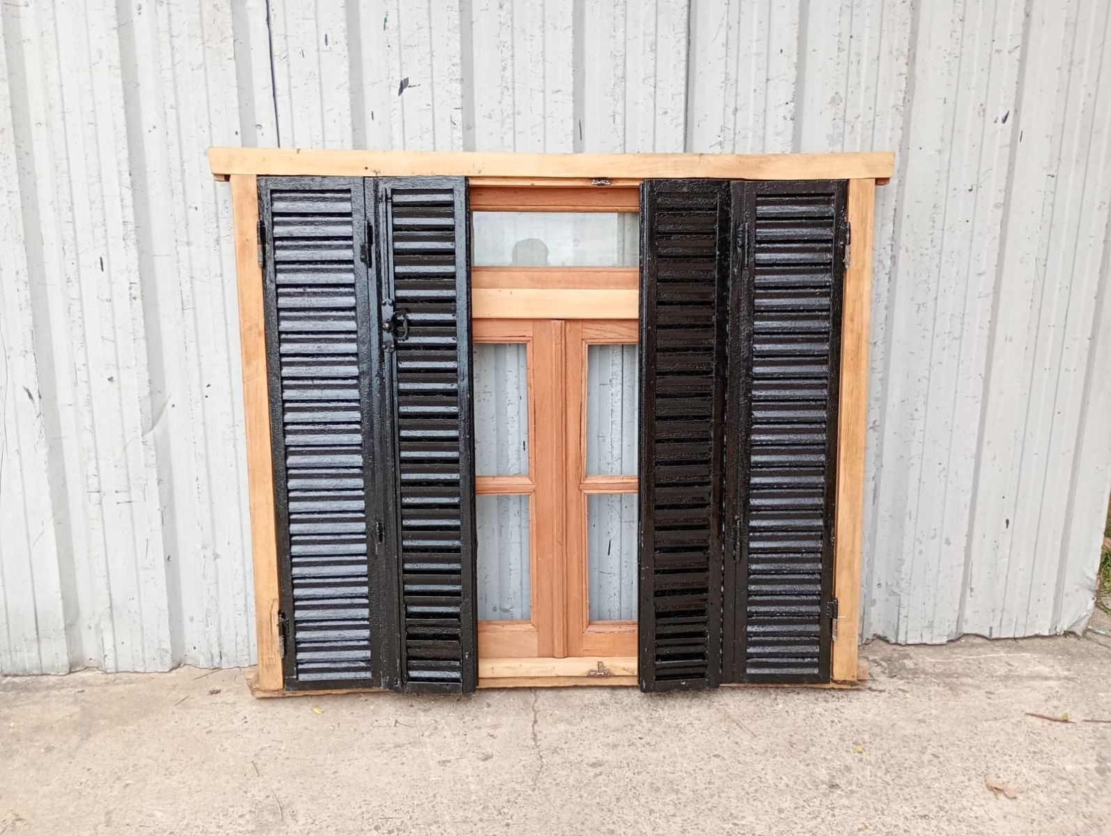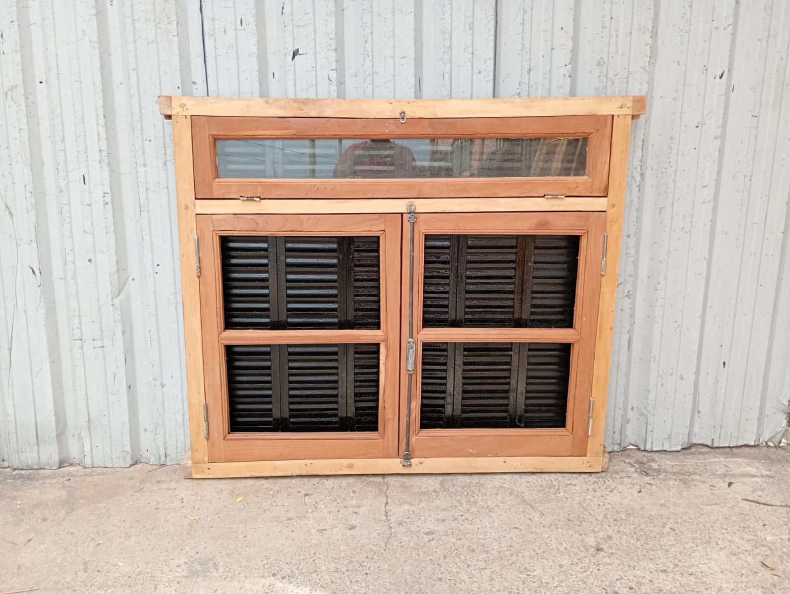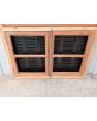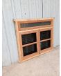 Ventana de madera antigua cedro al natural. Es a dos hojas de abrir, con vidrios tipo partidos, falleba, tapajunta, banderola vidriada de abrir, celosías de hierro y marco de madera dura. La abertura no incluye los vidrios. Hojas de 65x85cm.