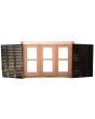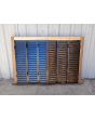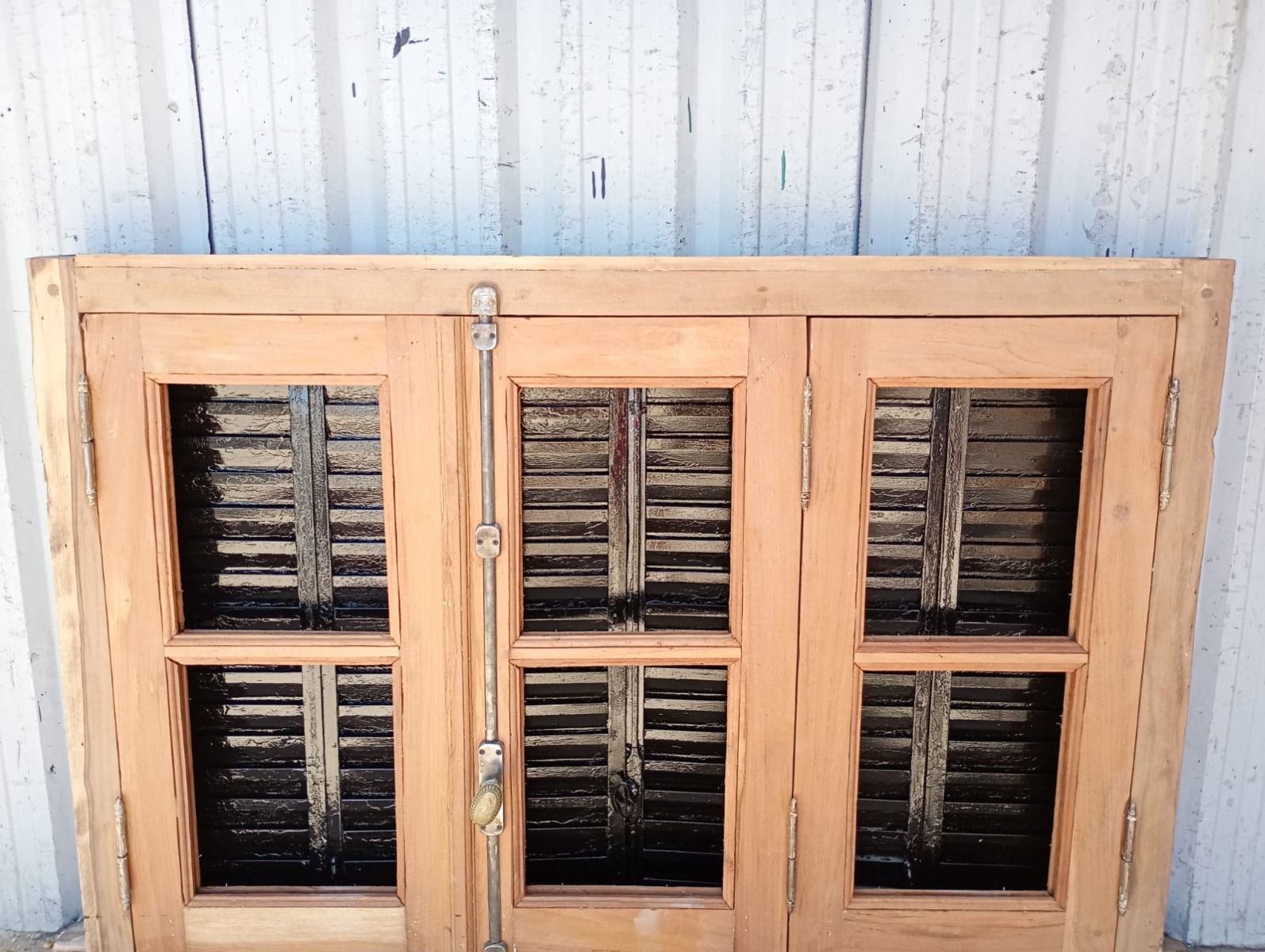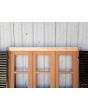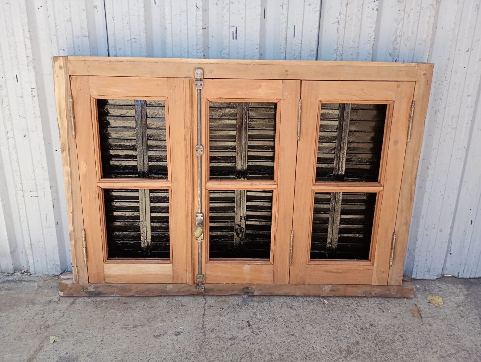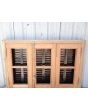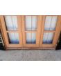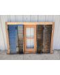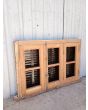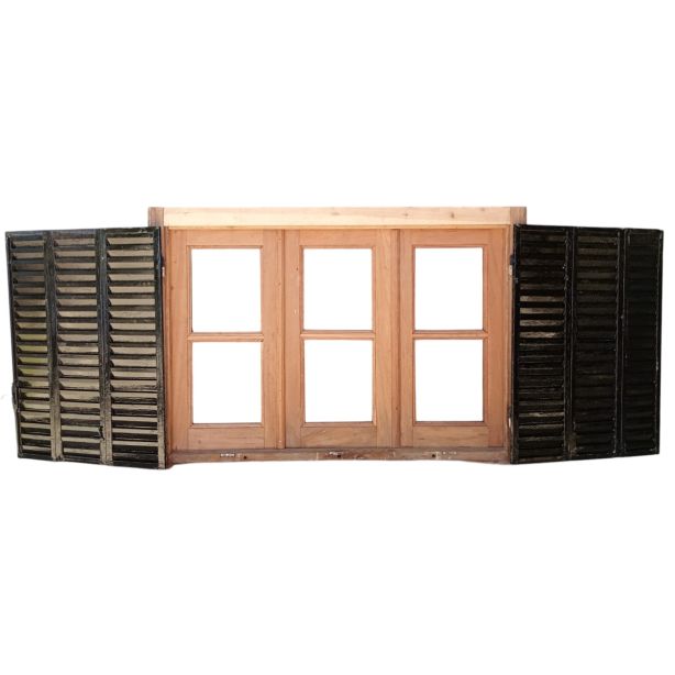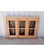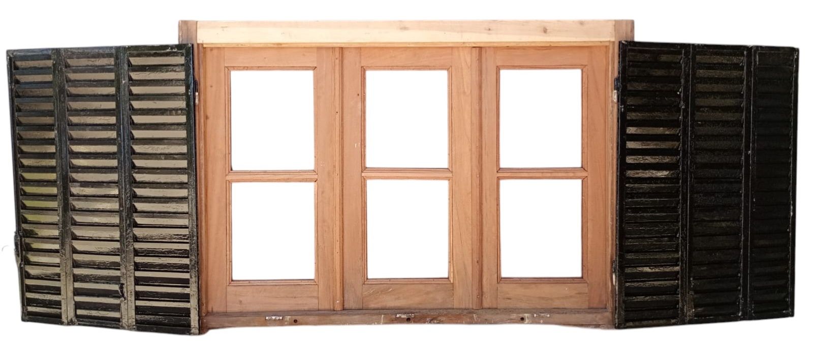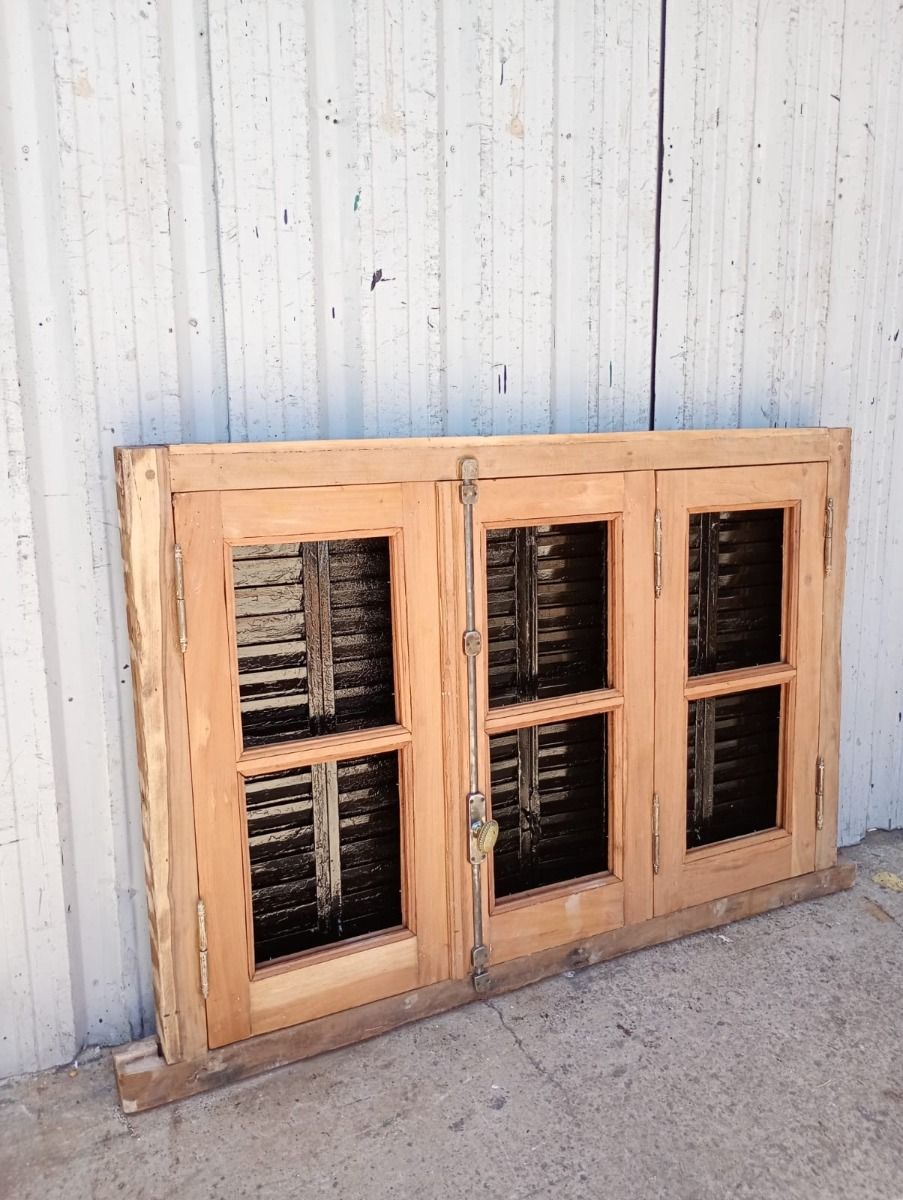 Ventana de madera antigua cedro al natural. Es a tres hojas de abrir, con vidrios tipo partidos en dos, fallebas, tapajuntas, celosías de hierro y marco de madera dura. La abertura no incluye los vidrios. Hojas de 48x98cm.