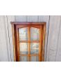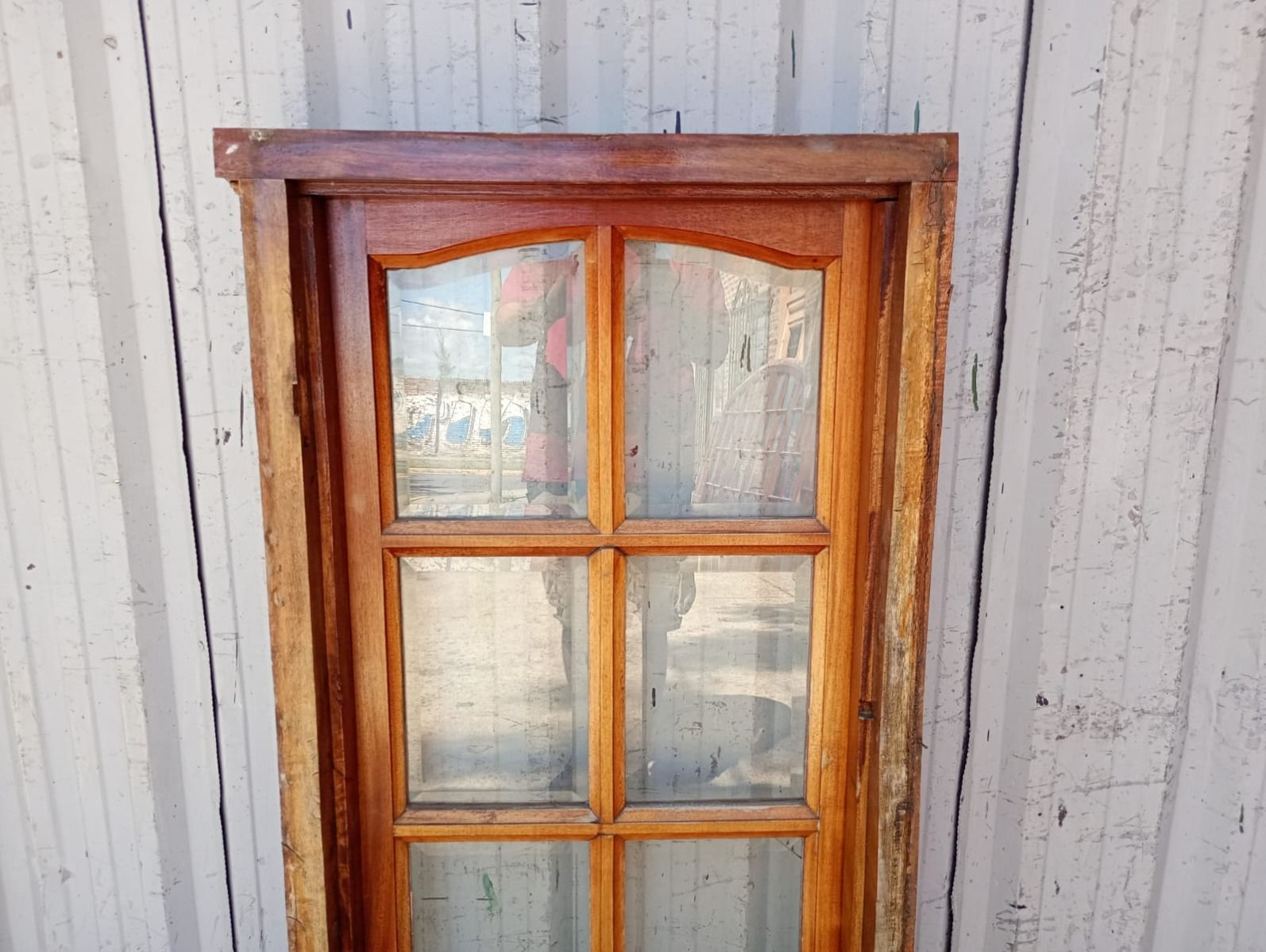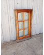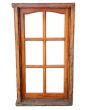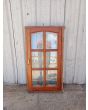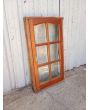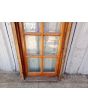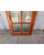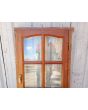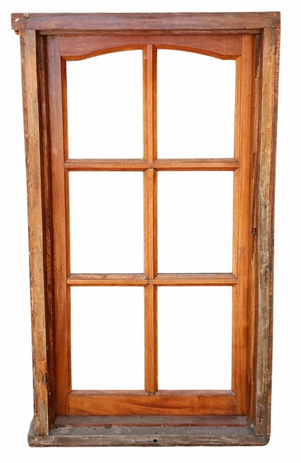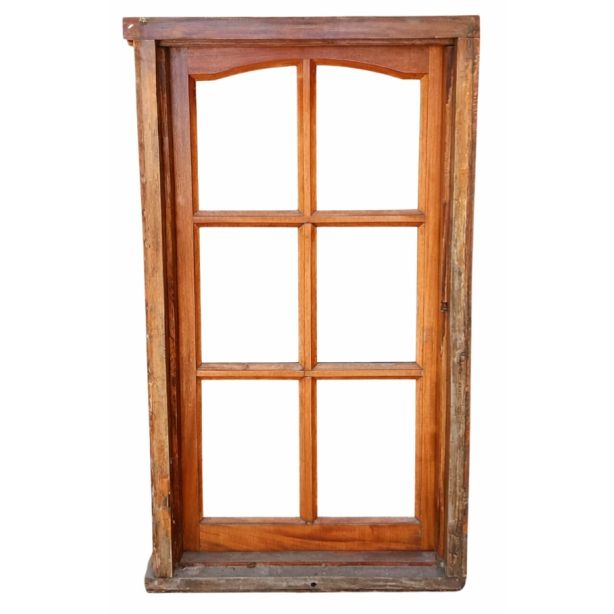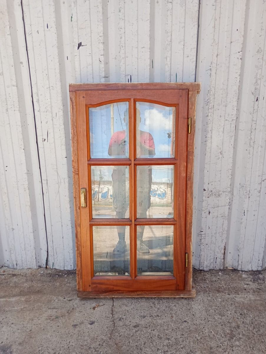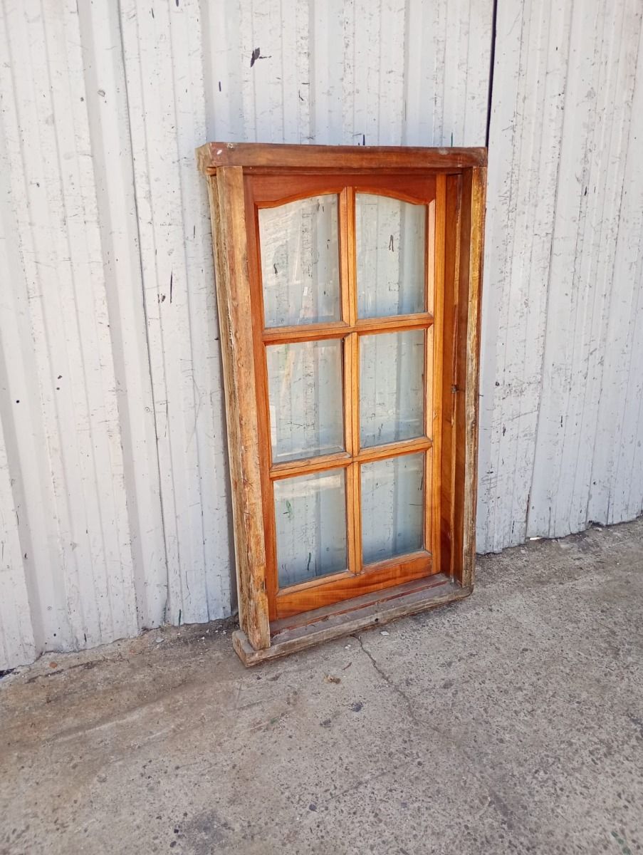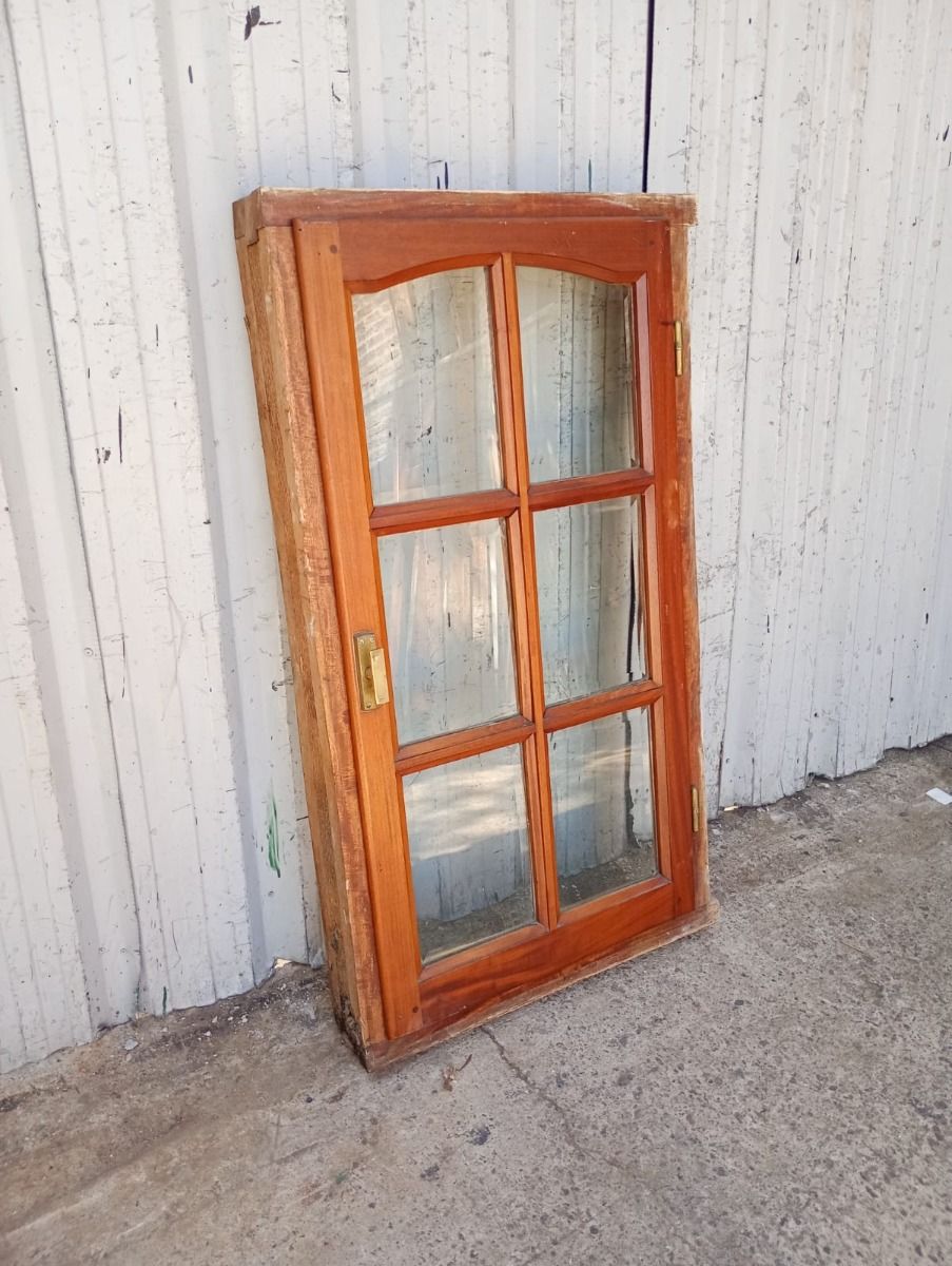 Antigua ventana de madera cedro al natural a una hoja de abrir hacia la derecha, con arco cuarto punto interno que tiene vidrios repartidos biselados, falleba y marco de madera dura. La abertura no incluye todos los vidrios. Hoja de 60x115cm.